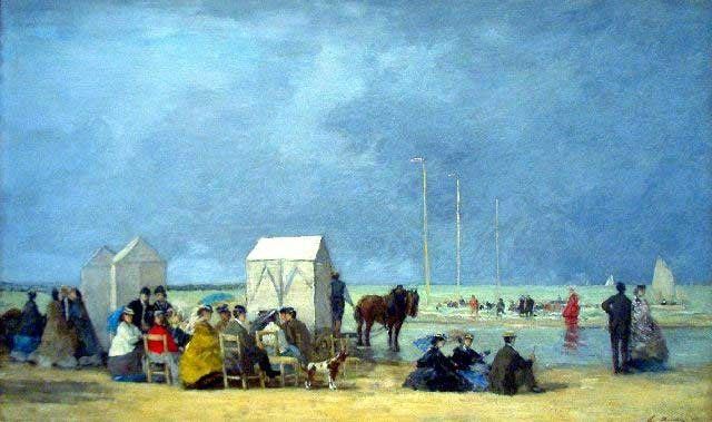 Artist: Eugene Louis Boudin - Title: Bathing Time at Deauville - Medium: Fine Art Reproduction Giclee on Canvas - Image Size: Approximately 11.75 inches x 20 inches - Unframed on Unstretched Canvas - Biography: Eugene Louis Boudin was one of the first French landscape painters to paint outdoors. Boudin was a marine painter, and expert in the rendering of all that goes upon the sea and along its shores. His pastels, summary and economic, garnered the splendid eulogy of Baudelaire; and Corot called him the "King of the skies".