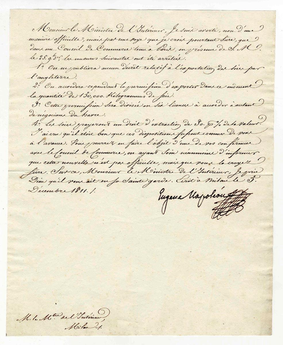 Napoleon's stepson, Eugene Napoleon, document signed as Viceroy of Italy, dated 5 December 1811 from Milan. Letter, handwritten in French, is addressed to the Minister of the Interior and discusses the exportation of bulls, reading in part, ''…We are not publicizing any decrees in regards to the exportation of bulls for England…'' Signed ''Eugene Napoleon'' with an elaborate paraph beside the signature in his hand. Document, measuring 8.25'' x 10'', has light toning, else near fine. Lot includes a portrait engraving of Eugene Napoleon.