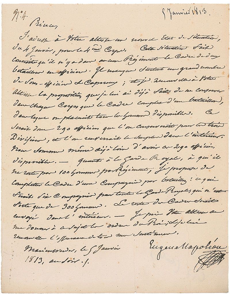 Adopted son of Napoleon Bonaparte (1781–1824), the natural son of Napoleon’s wife, Josephine, and Alexandre, Vicomte de Beauharnais, who had been executed during the Reign of Terror. Eugène proved to be an able military leader and, in addition to serving as Napoeon’s aide-de-camp, led several campaigns in Italy and Russia. LS in French, one page, 7 x 9, January 9, 1813. Untranslated letter addressed at the top, “Prince.” In fine condition, with intersecting folds, a bit of light toning, and a few small tack holes to lower left.