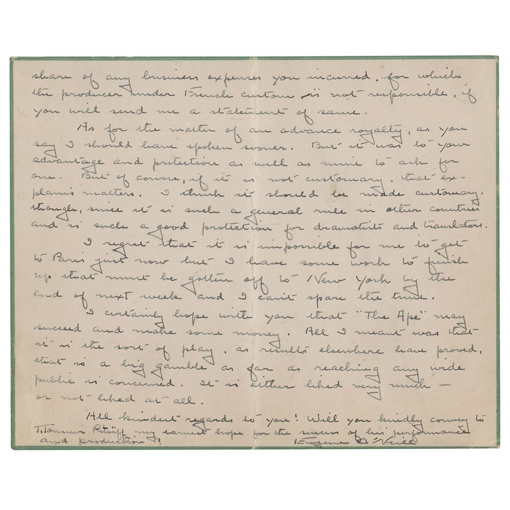 ALS, one page both sides, 5.75 x 4.75, Le Plessis letterhead, September 19, [no year]. Letter to "Mr. Bourgeois," in part: "I have signed the papers you sent and am enclosing them to you herewith. I have put down as my address care of the American Play Co. It is possible I may have to return to America before long and that address will always reach me. Moreover, since the agreement between us for 'The Hairy Ape' translation was made stronger…all royalty payments should be made to them for me and cannot be made directly to me. I will be only too glad to pay my share of any business expenses you incurred, for which the producer under French custom is not responsible…As for the matter of an advance royalty, as you say I should have spoken sooner. But it was to your advantage and protection as well as mine to ask for one. But of course, it is not customary…I certainly hope with you that 'The Ape' may succeed and make some money. All I meant was that it is the sort of play, as results elsewhere have proved, that is a big gamble as far as reaching any wide public is concerned. It is either liked very much—or not liked at all." In fine condition, with a central vertical fold.