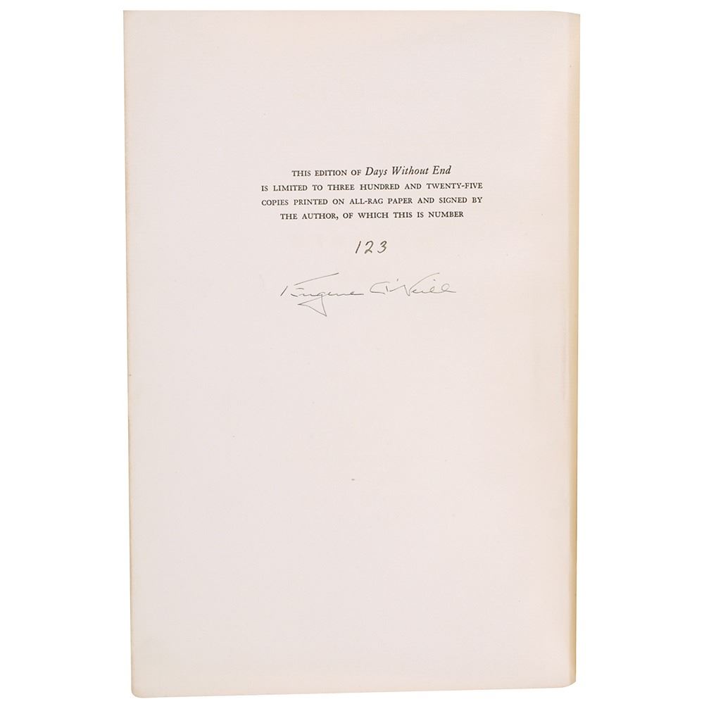 Signed book: Days Without End. First edition, limited issue, numbered 123/325. NY: Random House, 1934. Hardcover with slipcase, 7 x 10, 157 pages. Signed on the colophon in fountain pen. Wear to top edges and heavy wear, splits, and some paper loss to slipcase, otherwise fine condition.