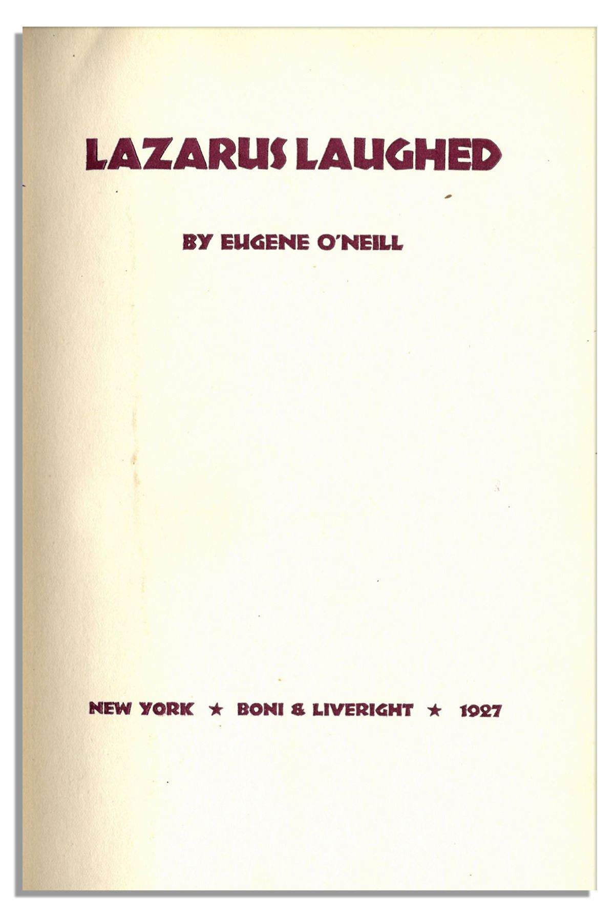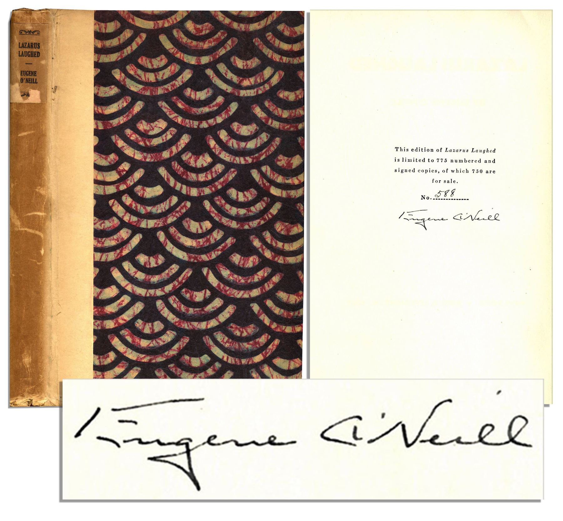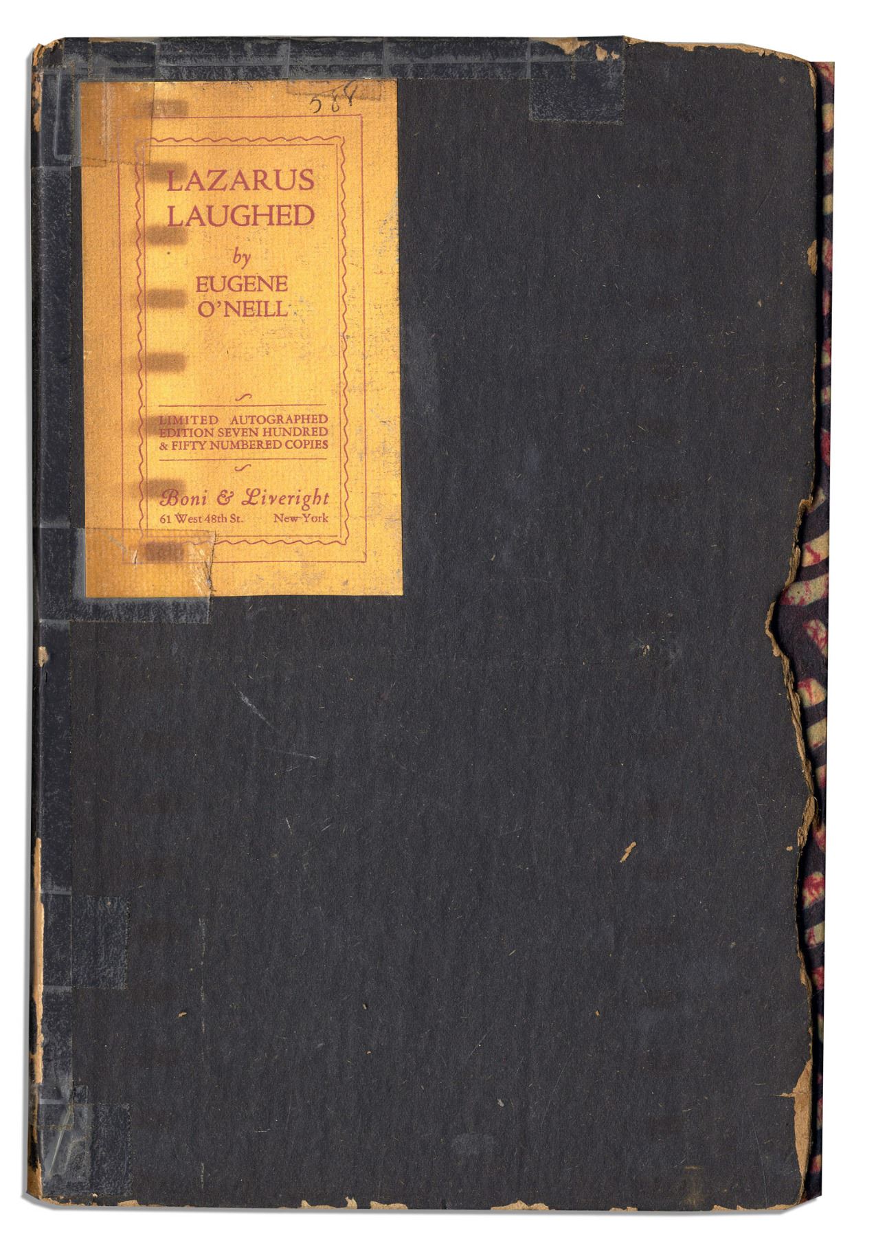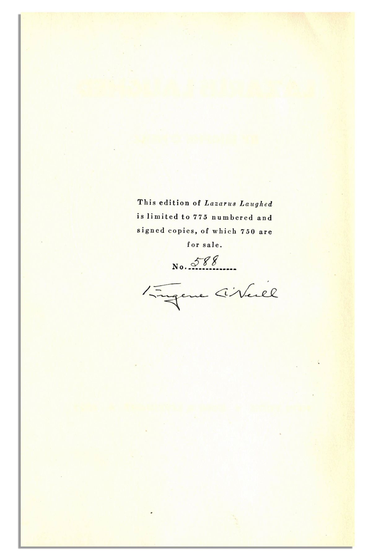 Eugene O'Neill ''Lazarus Laughed '' limited edition signed. Published by Boni & Liveright: New York: 1927, this is number 588 of 775 numbered copies of the play, of which 750 were for sale. Limitation page is signed, ''Eugene O'Neill'' in black ink. This play is one of O'Neill's philosophies on religious thought, akin to a mystery play, taking place in a Biblical setting. Play runs 179pp. and its deckled edge leaves come bound in multicolor paper boards. Measures 6.25'' x 9.25''. Sunning to backstrip and toning to endpapers, else fine. Housed in a fair black paper slipcase.