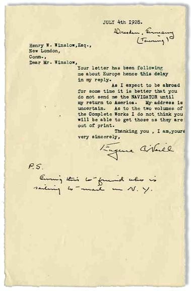 Eugene O'Neill typed letter signed, dated 4 July 1928 from Dresden, Germany. Letter is addressed to Henry W. Winslow, Esq. and reads in part: ''…it is better that you do not send me the NAVIGATOR until my return to America…As to the two volumes of the Complete Works I do not think you will be able to get those as they are out of print…Eugene O'Neill / P.S. Giving this to friend who is sailing to mail in N.Y.'' 5.25'' x 8.25'' letter is in near fine condition with bold signature in black ink.