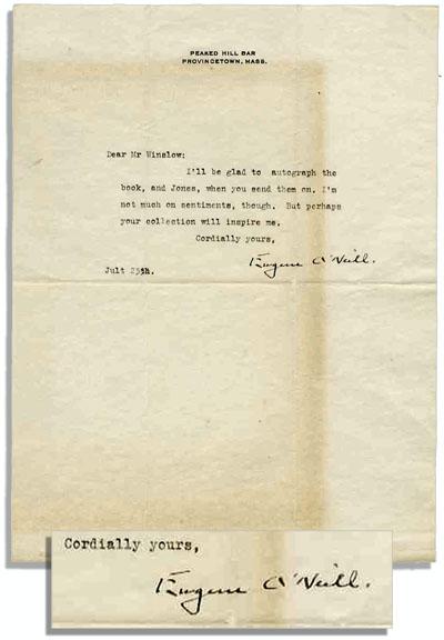 Eugene O'Neill typed letter signed, dated 25 July with no year, on ''Peaked Hill Bar / Provincetown, Mass.'' stationery, where the famed playwright kept a summer home. Letter, addressed to a Mr. Winslow, reads, ''I'll be glad to autograph the book, and Jones, when you send them on. I'm not much on sentiments, though. But perhaps your collection will inspire me. Cordially yours, Eugene O'Neill''. Letter, measuring 8.5'' x 11'', has minor toning and mailing folds, else near fine.