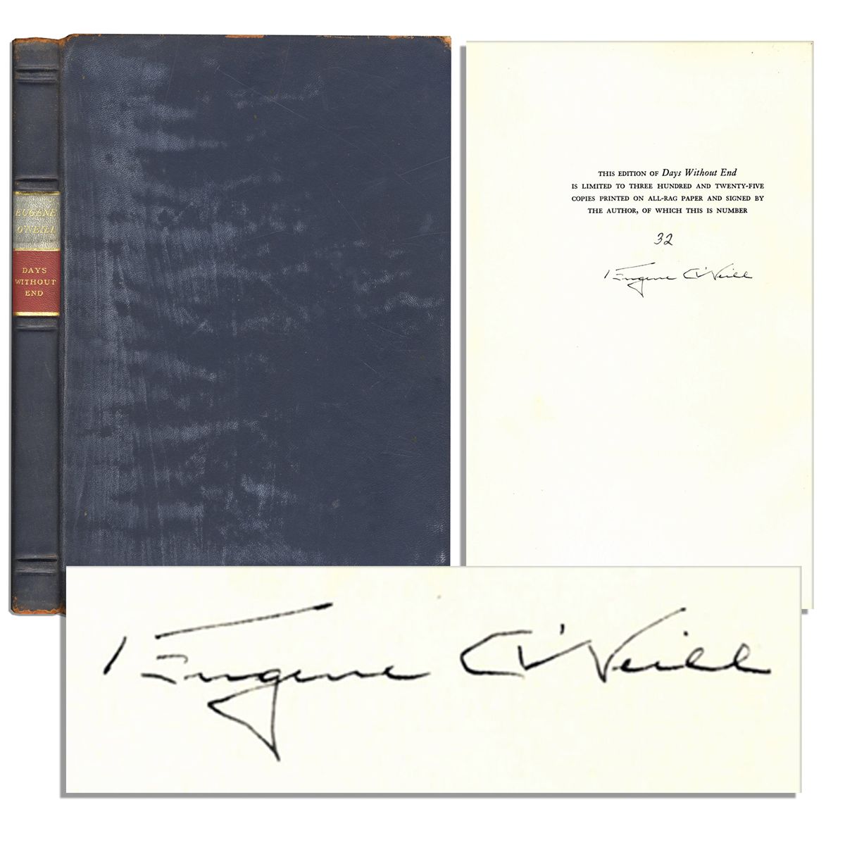 Eugene O'Neill ''Days Without End'' first edition signed. This is number 32 of 325 bound copies of the play published by Random House: New York: 1934. Its limitation page is signed, ''Eugene O'Neill'' in black ink. This play was the first to be uncharacteristically panned by critics following O'Neil's run of successes including ''Mourning Becomes Electra'', ''Ah, Wilderness!'' and Pulitzer Prize-winning hits ''Anna Christie'' and ''Strange Interlude''. ''Days...'' runs 157pp. and comes bound in blue leather boards with red and blue print blocks and gilt lettering to spine. Deckled edges and top edge gilt. Measures 7'' x 9.75''. Light toning and soiling to endpapers and wear to boards with some surface loss of leather to edges and corners, else near fine.