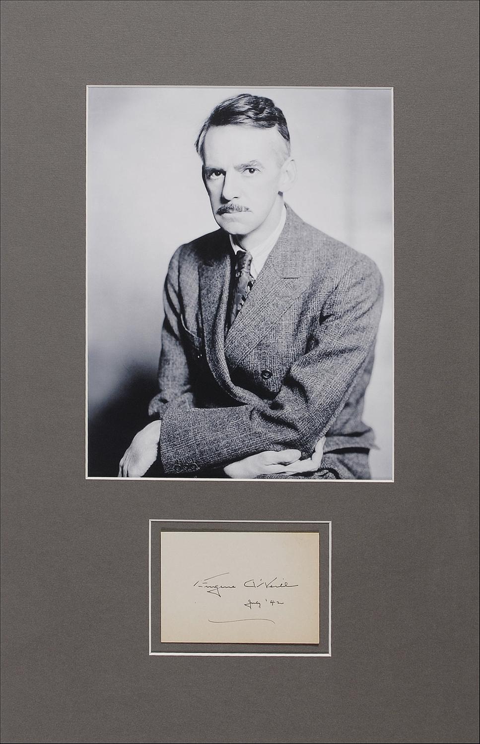 Ink signature, “Eugene O’Neill, July ‘42,” on an off-white 3.5 x 2.5 card. Removably affixed to a mount, and matted with a portrait of O’Neill to an overall size of 11 x 17. In fine condition, with some mild toning to two edges.