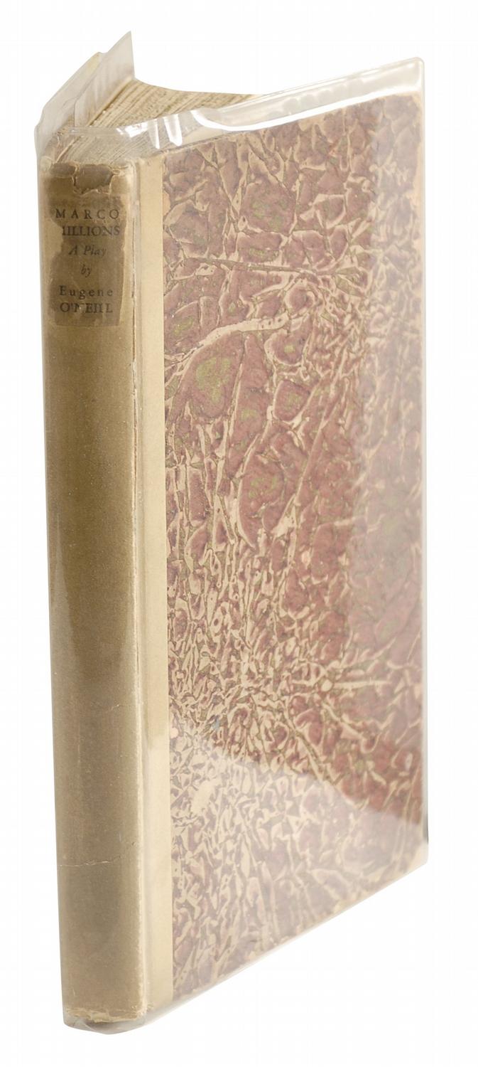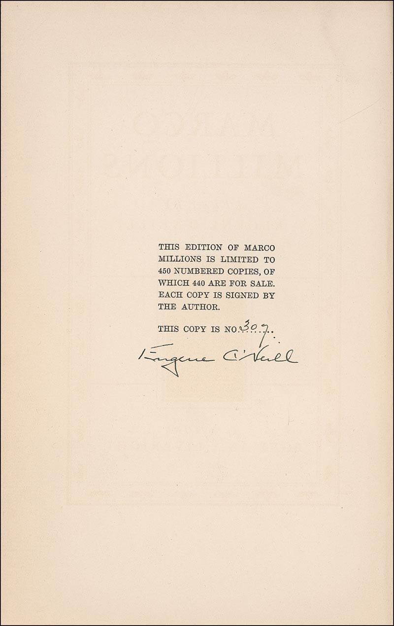 Signed book: Marco Millions. Limited edition of 450 copies (this copy No. 307). NY: Boni and Liveright, 1927. Hardcover, 6 x 9.5, 180 pages. Signed in black ink on the limitation page. Large tear and separation along the hinge and the front board joint, the first few pages lightly toned, a prior owner’s inscription on the first free end page, chipping to label and head of spine, and moderate soiling to the spine, otherwise very good condition.