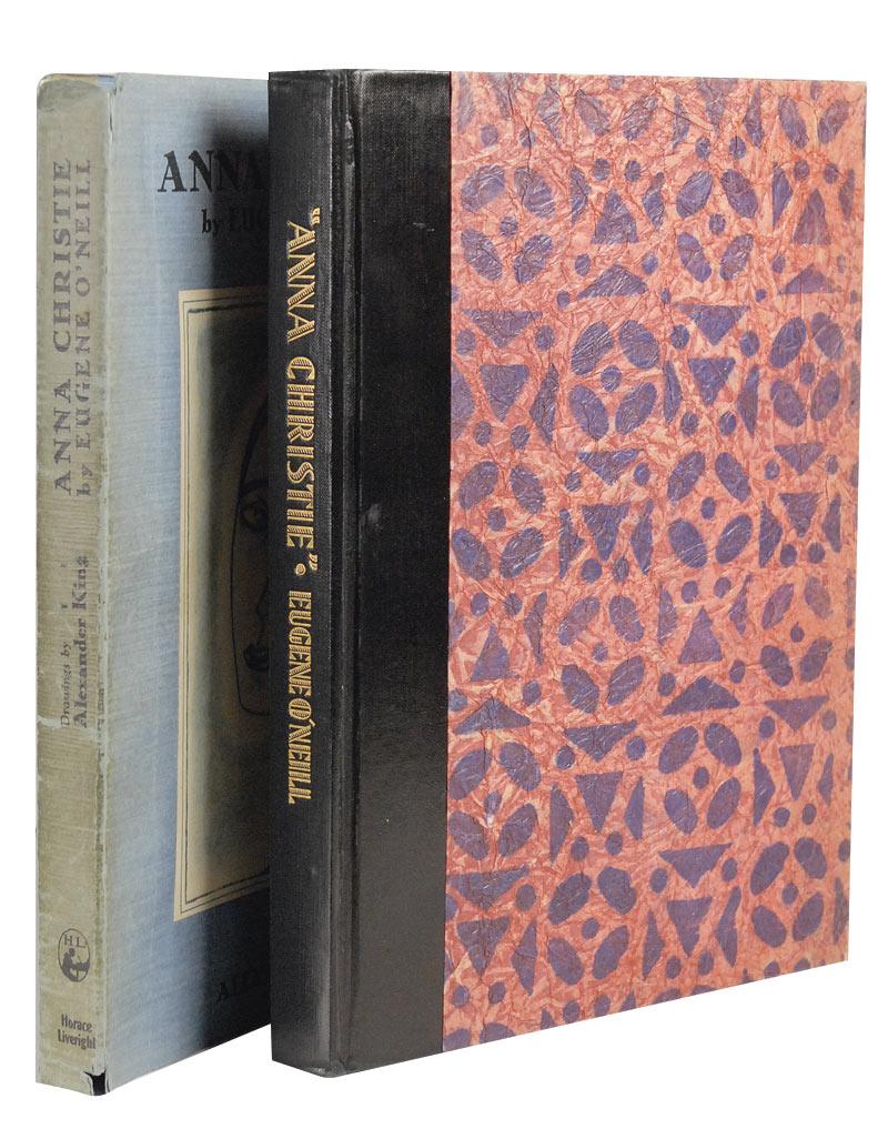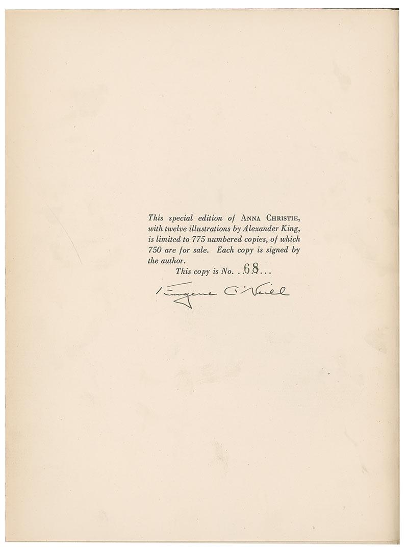 American playwright (1888–1953) who occupies a central place in the history of twentieth-century drama. Among his most famous works are The Iceman Cometh, Mourning Becomes Electra, and Long Day’s Journey into Night. A four-time winner of the Pulitzer Prize, he was also awarded the Nobel Prize in Literature in 1936. Signed book: Anna Christie. Limited edition. NY: Horace Livewright, 1930. Hardcover with slipcase, 8 x 10.25, 161 pages. Signed “Eugene O’Neill” on the limitations page, which reads, “This special edition of Anna Christie, with twelve illustrations by Alexander King, is limited to 775 numbered copies, of which 750 are for sale. Each copy is signed by the author. This copy is No. 68.” In very good condition, with a mild shade of toning to pages, scattered toning to dustjacket, small tears to head and tail, and slipcase in several pieces.
