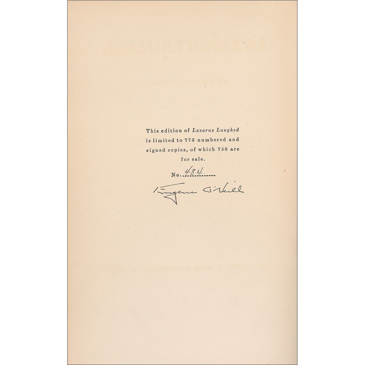 Signed book: Lazarus Laughed. Limited edition first edition of 775 copies, this being No. 484. NY: Boni & Liveright, 1927. Hardcover, 6 x 9, 177 pages. Signed in fountain pen on the limitations page, “Eugene O’Neill.” In very good condition, with a uniform shade of toning to the pages throughout, a loose, but intact, hinge, and mild toning, soiling to the cover, along with staining to the top of the spine, and light wear to the head and tail of spine.