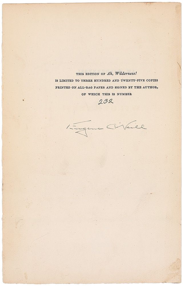 Colophon removed from a 1933 limited edition of Ah, Wilderness!, numbered #232/325, signed in black ink, “Eugene O’Neill.” In fine condition, with light scattered toning and soiling.