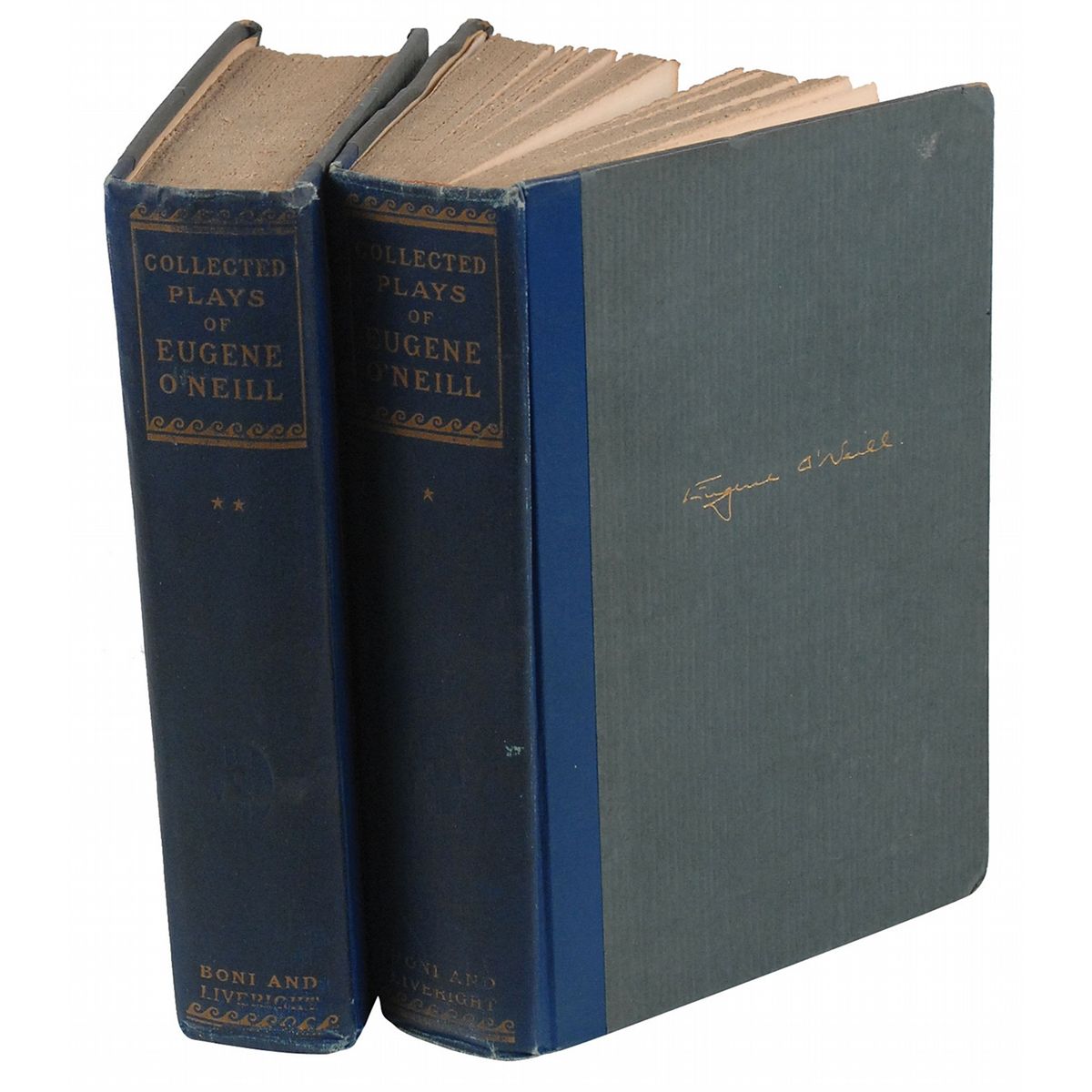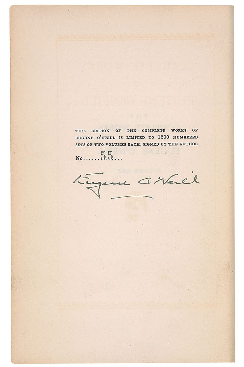 Signed book: Collected Plays of Eugene O’Neill, Volumes I and II. Limited edition of 1200 copies (this being No. 55). NY: Boni and Liveright, 1924. Hardcover, 6 x 9, 501 and 456 pages. Signed on the colophon in Volume I. Autographic condition: some light mirroring of title page over signed page, otherwise fine condition. Book condition: VG-/None. Two volumes with blue cloth-covered spines and paper-covered boards. Both volumes have worn edges (with bumps/tears at corners and spine-ends); soiling and rubbing to exteriors; expected wear to deckled edges; yellowing and slightly sunned spines; a bookplate to both ffeps. Volume I is slightly shaken, and volume II has a cracked rear hinge.