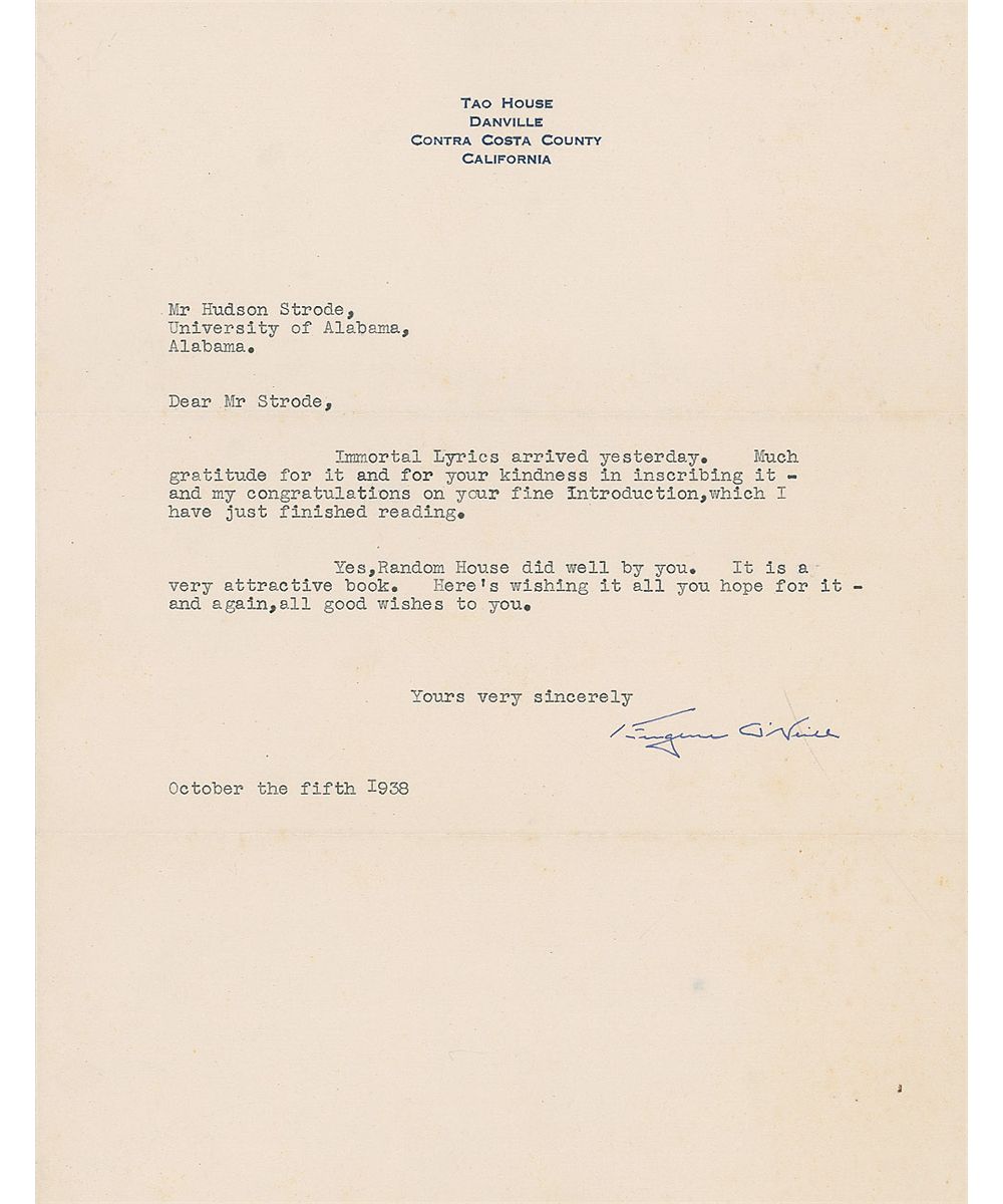 ALS, one page, 8.5 x 11, Tao House letterhead, October 5, 1938. Letter to author Hudson Strode. In part: “Immortal Lyrics arrived yesterday. Much gratitude for it and for your kindness in inscribing it…Random House did well by you. It is a very attractive book.” In fine condition, with subtle scattered foxing.