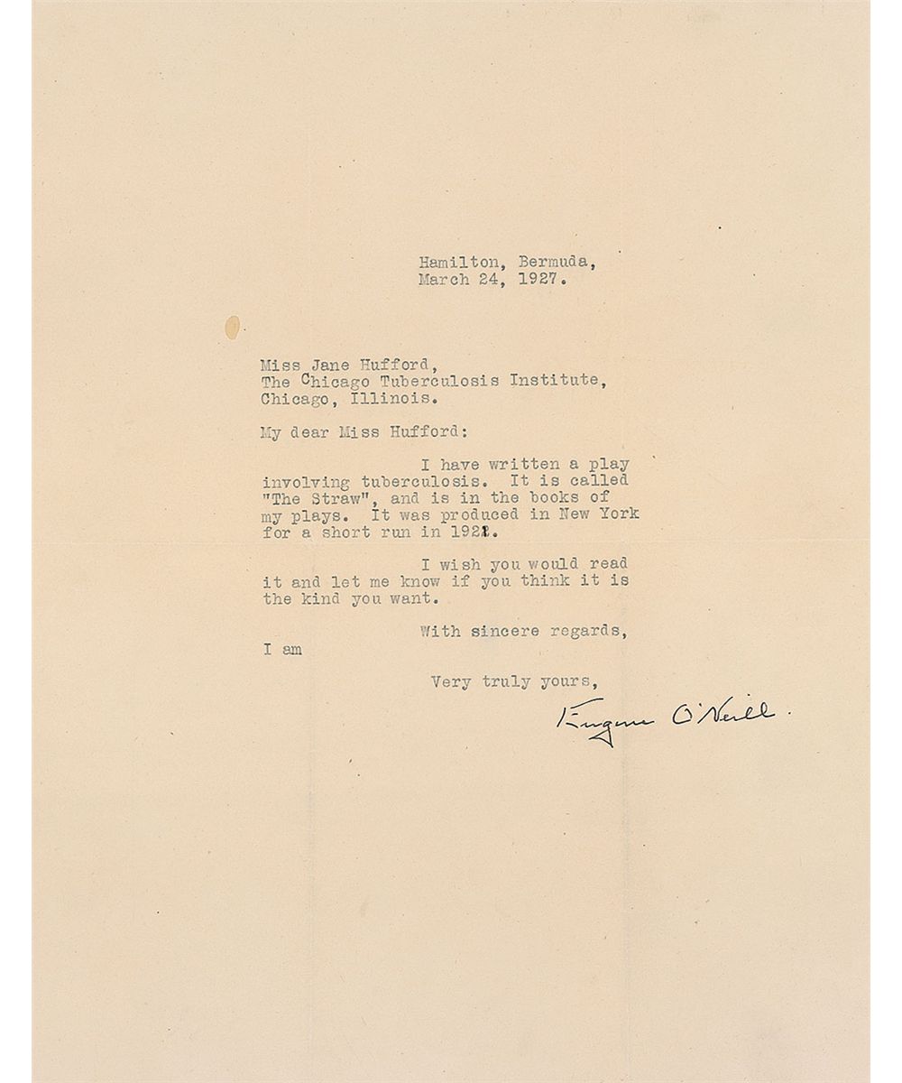 TLS, one page, 8.25 x 11, March 24, 1927. From Bermuda, O’Neill writes to a woman at the Chicago Tuberculosis Institute. In full: “I have written a play involving tuberculosis. It is called ‘The Straw,’ and is in the books of my plays. It was produced in New York for a short run in 1921. I wish you would read it and let me know if you think it is the kind you want.” In fine condition, with intersecting folds, one through a single letter of signature, and a light spot to left side. Accompanied by the original mailing envelope.