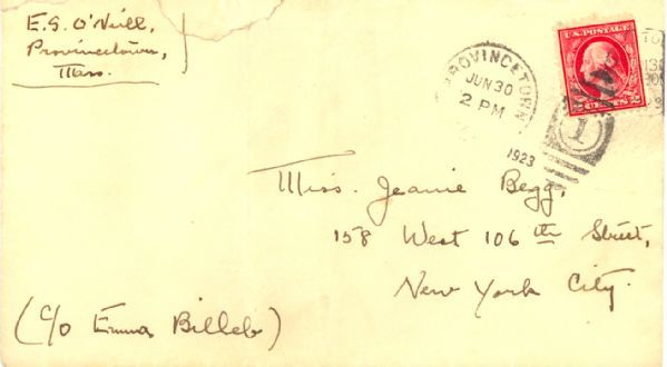 Hand-addressed envelope, 6.5 x 3.5, addressed by O’Neill to actress “Miss Jeanie Begg, 158 West 106th Street, New York City, c/o Emma Billeb,” and signed in the return address area, “E. G. O’Neill, Provincetown, Mass.” Envelope is postmarked June 30, 1923. A vertical crease, small tear to top edge next to O’Neill’s signature, and light creases, otherwise fine condition.