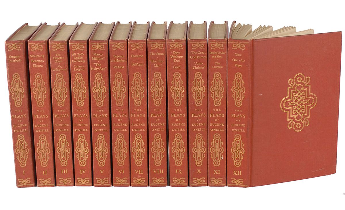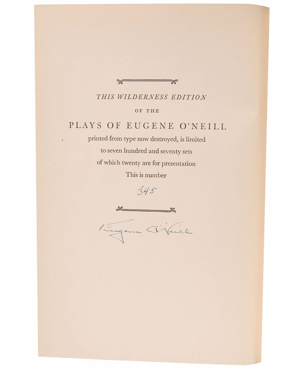 Signed book: The Plays of Eugene O’Neill Volumes 1-12. Limited first edition of 770 copies (this being No. 345). NY: Charles Scribner's Sons, 1934. Hardcover, 6.5 x 9.5. Signed in fountain pen on the colophon in Volume I by O’Neill. In fine condition.