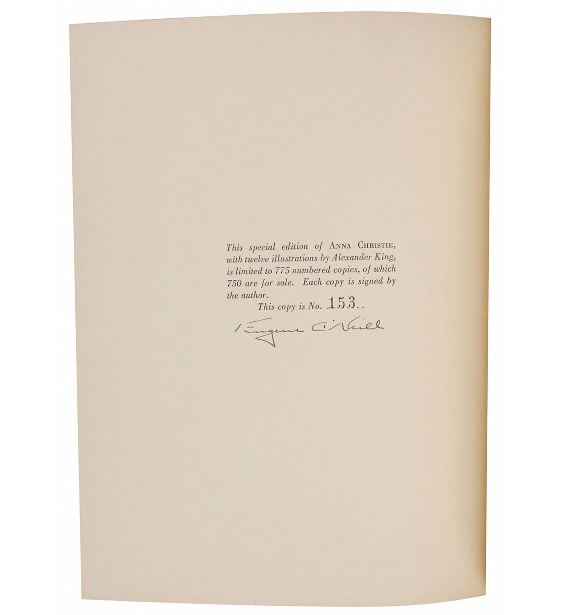 Signed book: Anna Christie. Special limited edition, numbered 153/775. NY: Horace Liveright, 1930. Hardcover with slipcase and dust jacket, 8 x 10.5, 161 pages. Neatly signed on the colophon in black ink. Several cracks and chips to slipcase, otherwise fine condition.