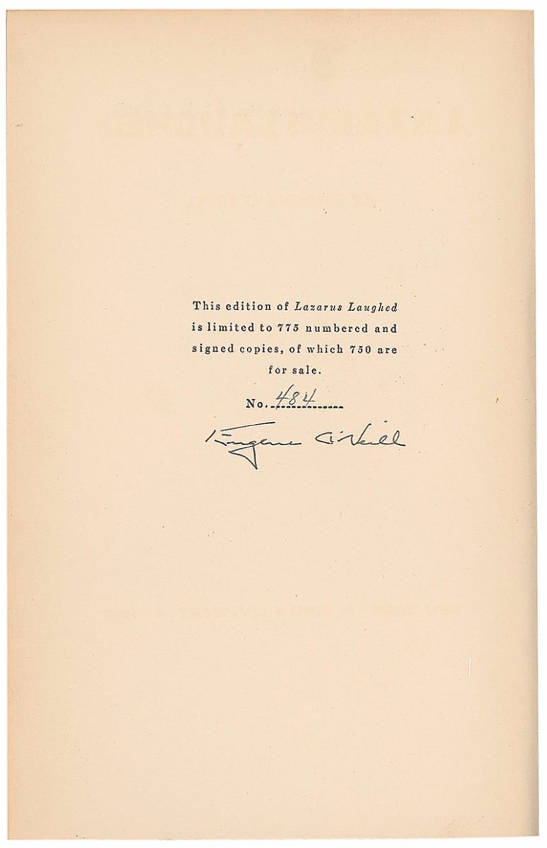 Signed book: Lazarus Laughed. Limited edition of 775 copies (this being number 484). NY: Boni and Liveright, 1927. Hardcover, 6 x 9.25, 179 pages. Signed on the colophon in black ink. Autographic condition: fine. Book condition: VG-/None.