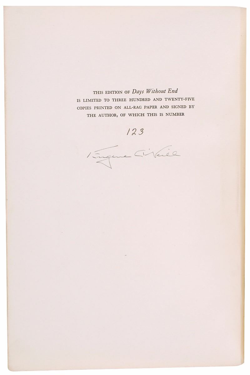Signed book: Days Without End. First edition, limited issue, numbered 123/325. NY: Random House, 1934. Hardcover with slipcase, 7 x 10, 157 pages. Signed on the colophon in fountain pen. Wear to top edges and heavy wear, splits, and some paper loss to slipcase, otherwise fine condition.