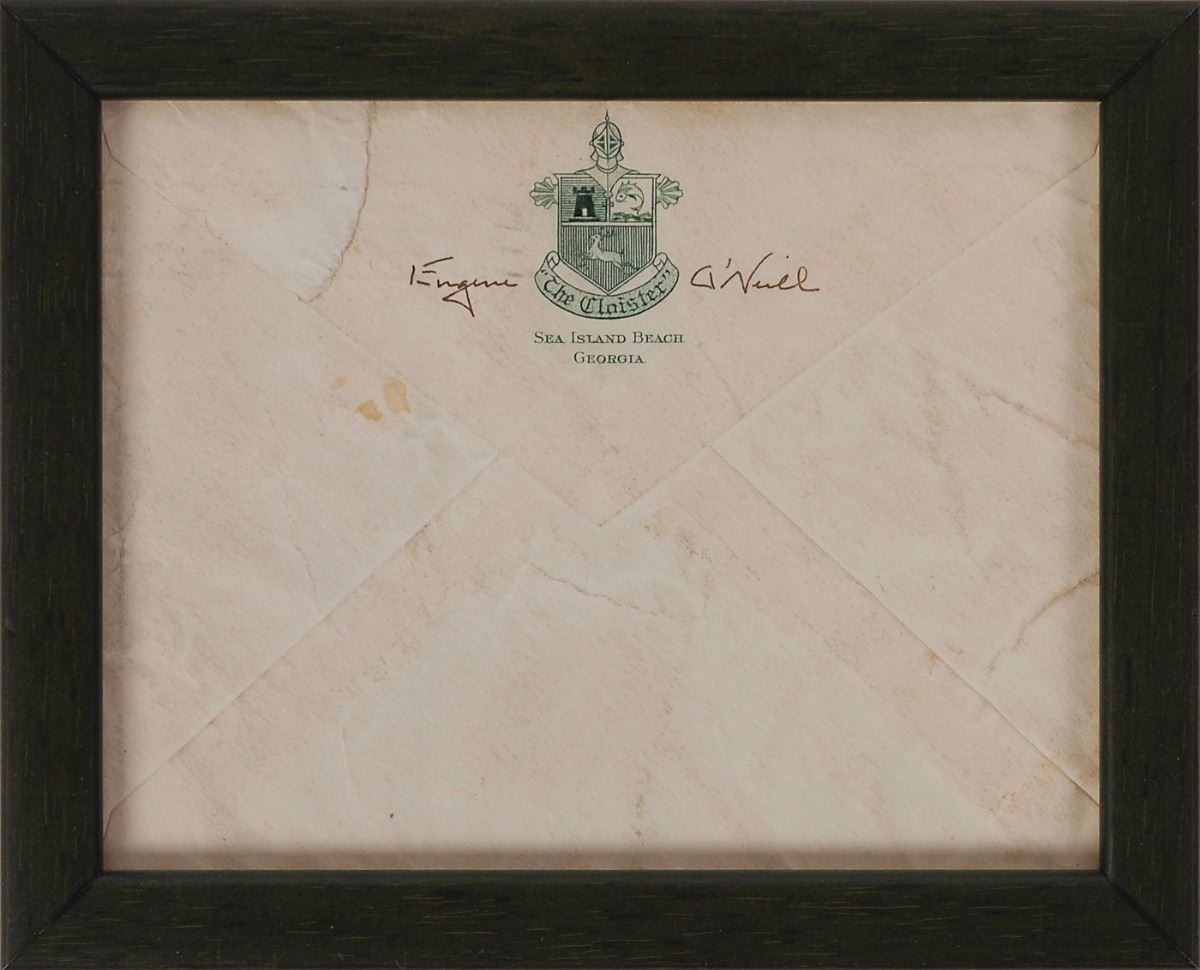 Hand-addressed mailing envelope, 5.5 x 4.25, addressed by O’Neill to “John Macy, Esq., 214 East 39th Street, New York City,” and signed on the flap, “Eugene O’Neill.” Postmarked Brunswick, Georgia, November 23, 1931. Framed with windows on both sides for viewing. In very good condition, with scattered creases, small stains, and a few tears from opening (affecting no writing).