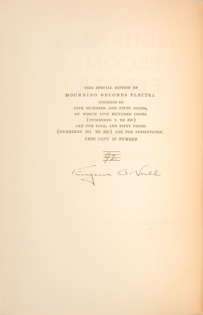 Signed book: Mourning Becomes Electra. Special limited edition, numbered 92/550. NY: Horace Liveright, 1931. Hardcover, 6.5 x 9.75, 257 pages. Neatly signed on the colophon in fountain pen. Includes the facsimile of O’Neill’s handwritten draft, as originally issued. In fine condition.