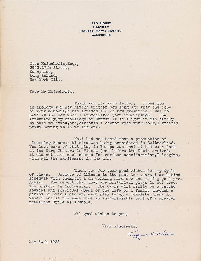 TLS, one page, 8.5 x 11, Tao House, Danville letterhead, May 30, 1938. Letter to author Otto Koischwitz, in part: "Unfortunately, my knowledge of German is so slight it can hardly be said to exist, but, although I cannot read your book, I greatly prize having it in my library. No, I had not heard that a production of 'Mourning Becomes Electra' was being considered in Switzerland. The last news of that play in Europe was that it had been done at the Burg Theatre in Vienna just before the Nazis arrived. It did not have much chance for serious consideration, I imagine, with all the excitement in the air. Thank you for your good wishes for my Cycle of plays, because of illness in the past two years I am behind schedule with them, but I am working hard now and making good progress. The report that they are historical plays is not true. The history is incidental. The Cycle will really be a psychological and spiritual drama of the life of a family through a period of over a century, each play being a complete drama in itself but at the same time an indispensable part of a greater drama, the Cycle as a whole." In fine condition.