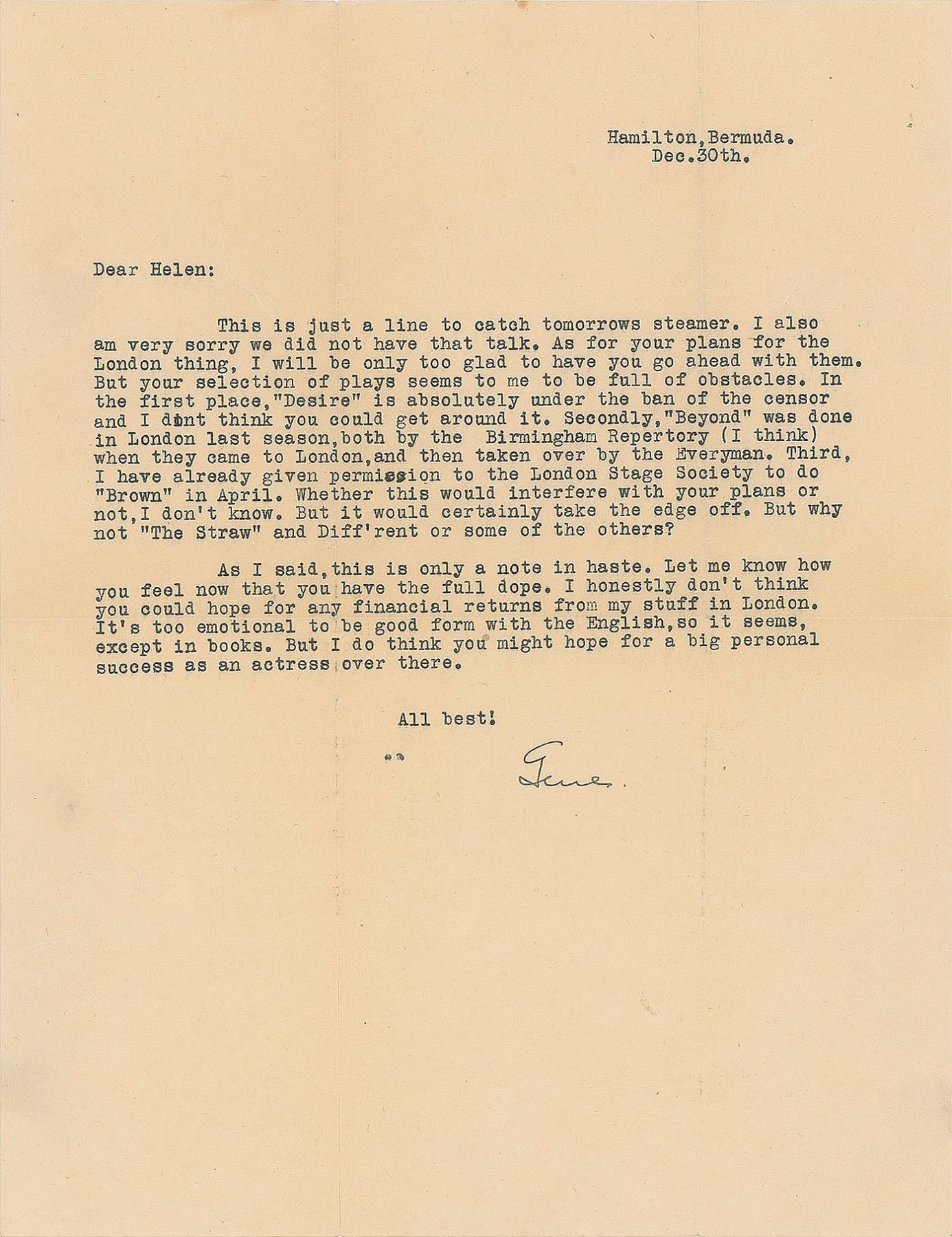 Very desirable collection of two TLSs and one ALS, signed “Gene” and “Gene O’Neill,” three total pages, each addressed to Helen Freeman. The ALS, written from Belgrade Lake, Maine, October 10, no year, in part: “This is just a line—because I hope to see you very soon—to tell you how very much I appreciated your fine letter about ‘Lazarus Laughed.’ I was quite overwhelmed by it, honestly! And I am deeply gratified to you for having written it! These are the letters that count. As for the point you bring up, let’s talk about it. I’ve been so concentrated on ‘Strange Interlude’ that ‘Lazarus’ is far off and vague for the moment and I haven’t a script of it around to get living it again so I could discuss that point with you.” A TLS, written from Hamilton, Bermuda, December 3, no year, in part: “I also am very sorry we did not have that talk. As for your plans for the London thing, I will be only too glad to have you go ahead with them. But your selection of plays seems to me to be full of obstacles. In the first place, 'Desire' is absolutely under the ban of the censor and I don’t think you could get around it. Secondly, 'Beyond' was done in London last season both by the Birmingham Repertory (I think) when they came to London, and then taken over by the Everyman. Third, l have already given permission to the London Stage Society to do 'Brown' in April. Whether this would interfere with your plans or not, I don’t know. But it would certainly take the edge off. Buy why not 'The Straw’ and Diff’rent or some of the others?” The second TLS, Hotel Wentworth letterhead, February 8, 1928, in full: “This is just a line to acknowledge your note about ‘Strange Interlude.’ As for my gratitude to you for your fine appreciation, I will save that to tell you when I see you. I am going out to California shortly, but I won’t be long out there.” Also included is holiday greeting card, measures 6 x 9.25 open, signed inside in black ink, “Gene.” In overall fine condition, with splitting to the folds of the larger typed letter.