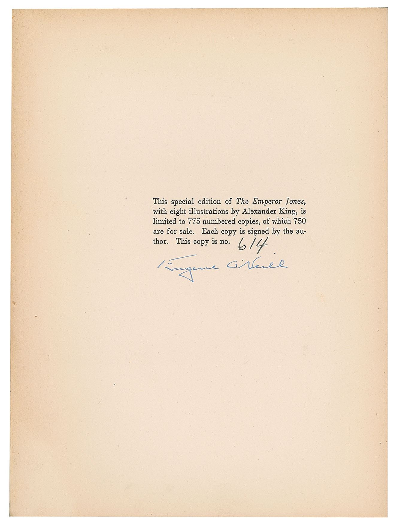 Signed book: The Emperor Jones. First edition, limited issue, numbered 614/775. NY: Boni & Liveright, 1928. Hardcover, 7.75 x 10.25, 90 pages. Signed on the colophon in fountain pen by Eugene O'Neill. Autographic condition: fine. Book condition: VG/None, with substantial edgewear and a small split at the head of the spine.