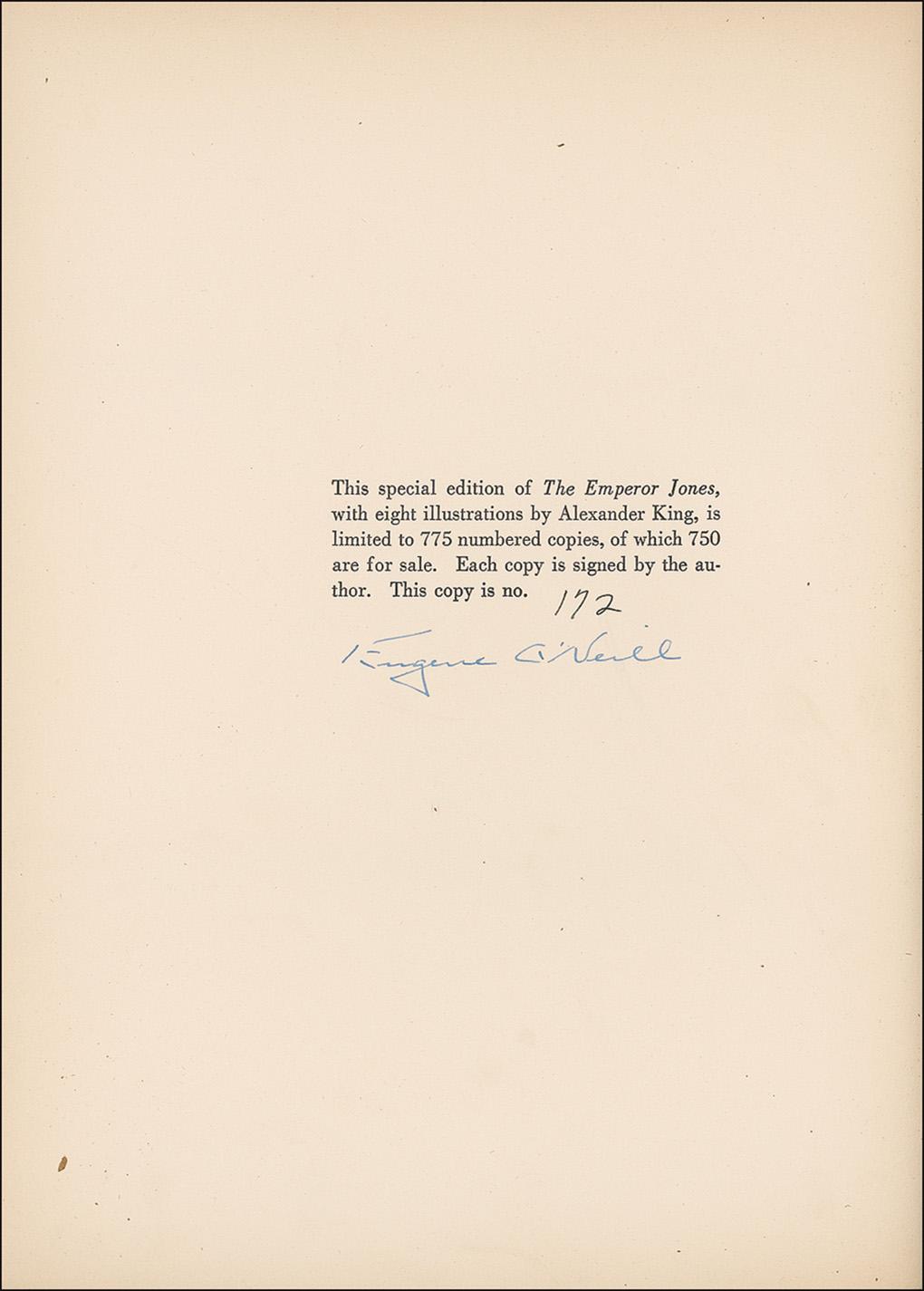 Signed book: The Emperor Jones. Limited signed first edition of 775 copies (this copy No. 172). NY: Boni & Liveright, 1928. Hardcover, 7.75 x 10.25, 90 pages. Signed in ink on the limitation page. In fine condition, with some light toning to inside pages. The dustjacket shows light rippling and soiling from moisture exposure, and chipping, paper loss, and sunning to the spine.