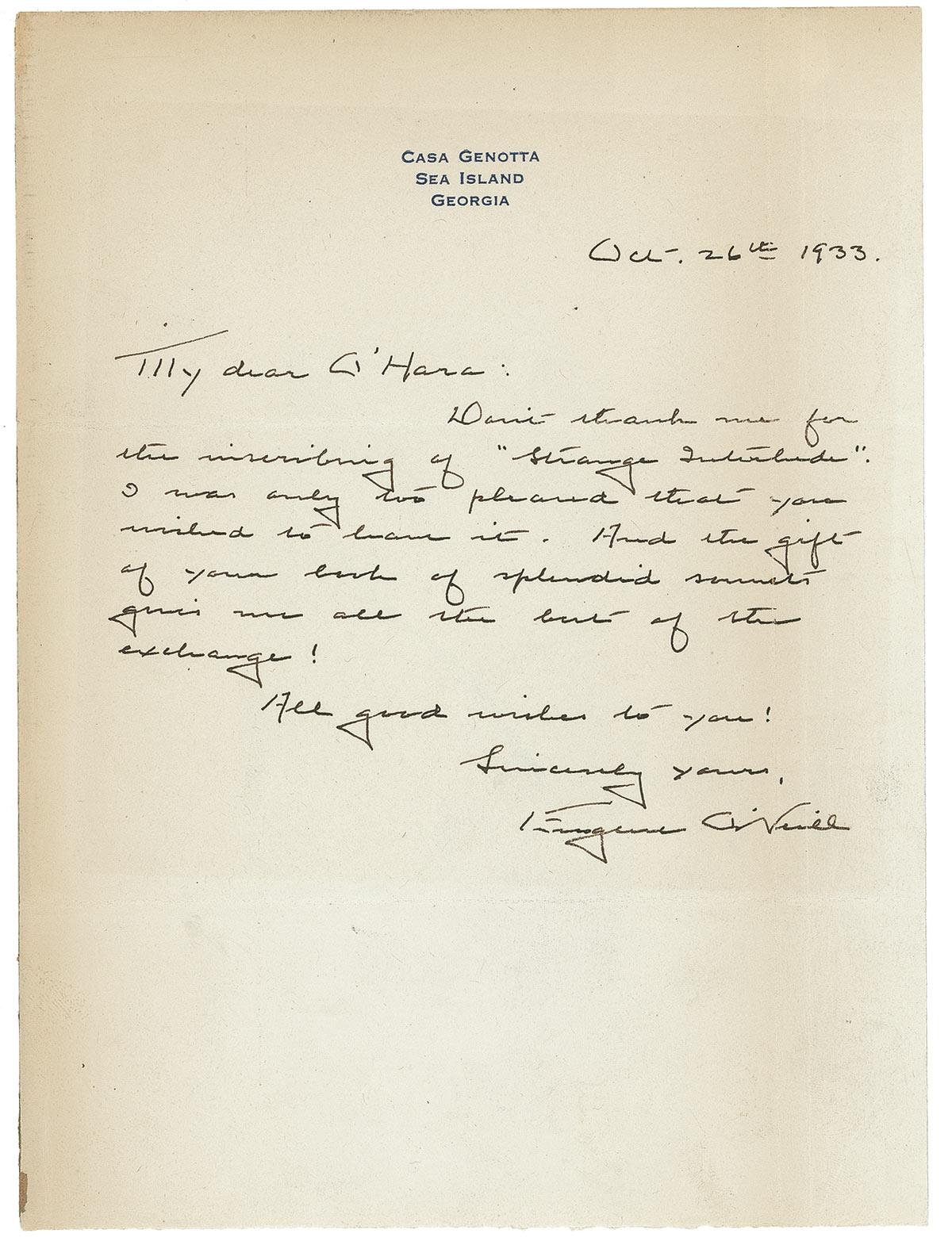 Strange Interlude, an experimental play using a a soliloquy that O’Neill finished in 1923 but not produced on Broadway until five years later, won the 1928 Pulitzer Prize in Drama. The work seems to have been a fitting trade for O’Hara’s sonnets, even though O’Neill proclaims to have gotten “the best of the exchange.” Although mostly known for his novels and short stories, O’Hara published Pagan Sonnet in 1923 when he was 18, with that almost certainly the gift he sent O’Neill. Desirable correspondence sent from a famed playwright to one of his contemporaries.