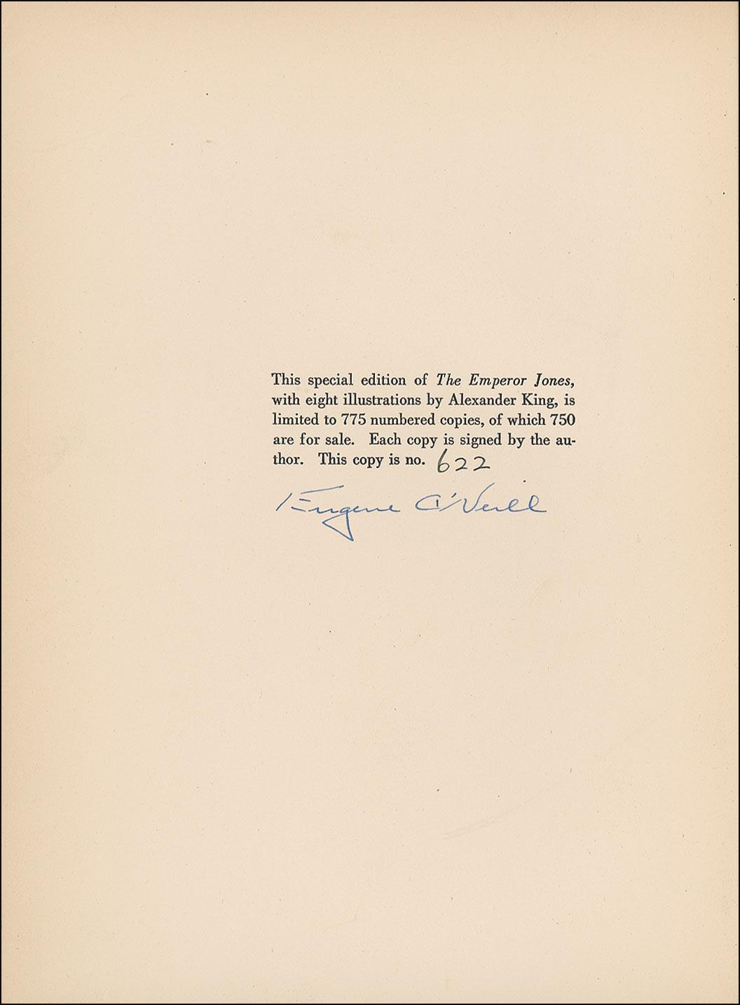 Signed book: The Emperor Jones. Special edition hardcover with slipcase limited to 775 copies, this is #622. NY: Boni & Liveright, 1928, 7.75 x 10.25, 90 pages. Signed on the limitations page in fountain pen, “Eugene O’Neill.” Clipped corners to the dustjacket, likely as intended, a few tiny tears and paper loss along the spine, and scattering soiling, otherwise fine condition; the slipcase rates very good with split and chipped boards and moderate toning on the spine.