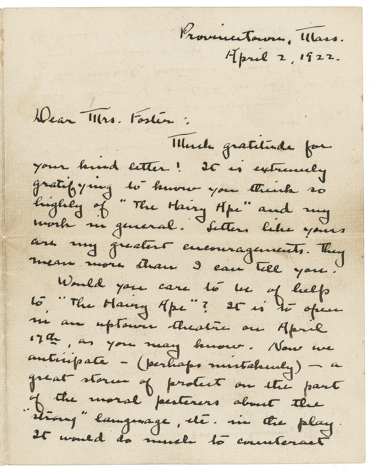 American playwright (1888–1953) who occupies a central place in the history of twentieth-century drama. Among his most famous works are The Iceman Cometh, Mourning Becomes Electra, and Long Day’s Journey into Night. A four-time winner of the Pulitzer Prize, he was also awarded the Nobel Prize in Literature in 1936. Scarce ALS, two pages, 5 x 6.5, April 2, 1922. In part, “It is extremely gratifying to know you think so highly of ‘The Hairy Ape’ and my work in general. Letters like yours are my greatest encouragements. They mean more than I can tell you. Would you care to be of help to the ‘Hairy Ape’? It is to open in an uptown theatre…we anticipate - (perhaps mistakenly) - a great storm of protest on the part of the moral pesterers about the ’strong’ language, etc. in the play. It would do much to counteract such silly criticism if the people who believe otherwise would write to the dramatic editors or critics. Wolcott of the Times or Macgowan of the Globe, say - voicing their opinions. Coming from women these letters would be doubly effective; for even if there was no space to print them they would undoubtedly influence the comment. Of course, such controversy may never break out. Lets hope for the sake of American right-sightedness it never does. But with so much twaddle about censorship in the air you never can tell. So if you see any screeches of the shocked in the papers three weeks from now it would be a great favor if you would send a rebuttal.” In fine condition, with some mild toning and soiling, and a small separation along edge of central horizontal mailing fold.
