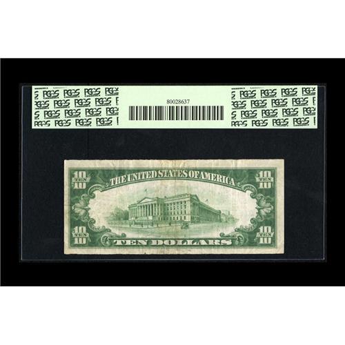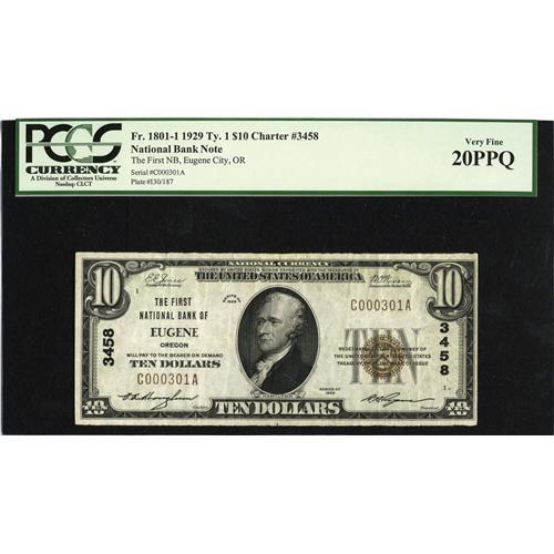 <B>Eugene, OR</B></I> - $10 1929 Ty. 1 <B>The First NB</B></I> Ch. # 3458<BR>It is always a pleasure to have notes from this tough western state. Simply a lovely representative with bright paper, strongly embossed surfaces and solid margins. Graded <B>Very Fine 20PPQ</B></I> by PCGS.