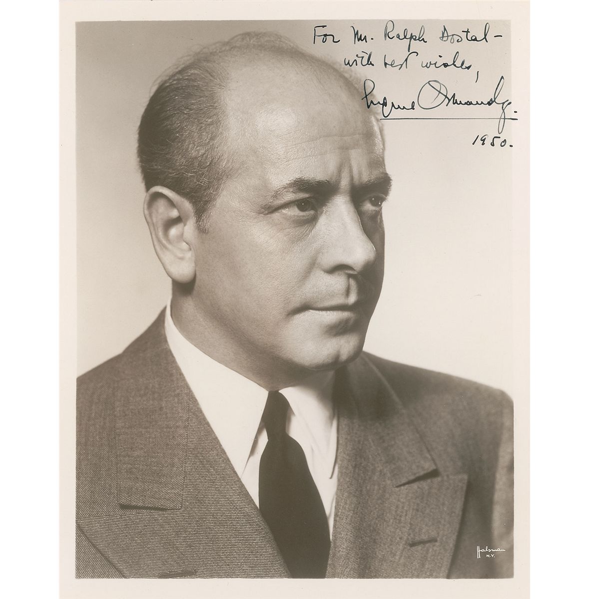 Highly regarded Hungarian-born conductor (1899–1985) who became internationally famous as the music director and conductor of the Philadelphia Orchestra. Exquisite vintage matte-finish 8 x 10 portrait of Ormandy by renowned photographer Philippe Halsman, signed and inscribed in fountain pen, “For Mr. Ralph Dostal—with best wishes, Eugene Ormandy, 1950.” In fine condition.