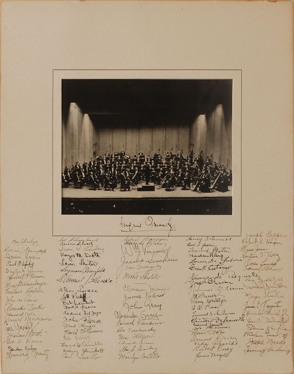 Vintage circa early 1960s glossy 9.25 x 7.25 photo of the Philadelphia Orchestra in its original 16 x 20 presentation mat, signed on the mat in ink by conductor Eugene Ormandy and over 80 members of the orchestra. In fine condition, with a few small surface impressions to the photo.