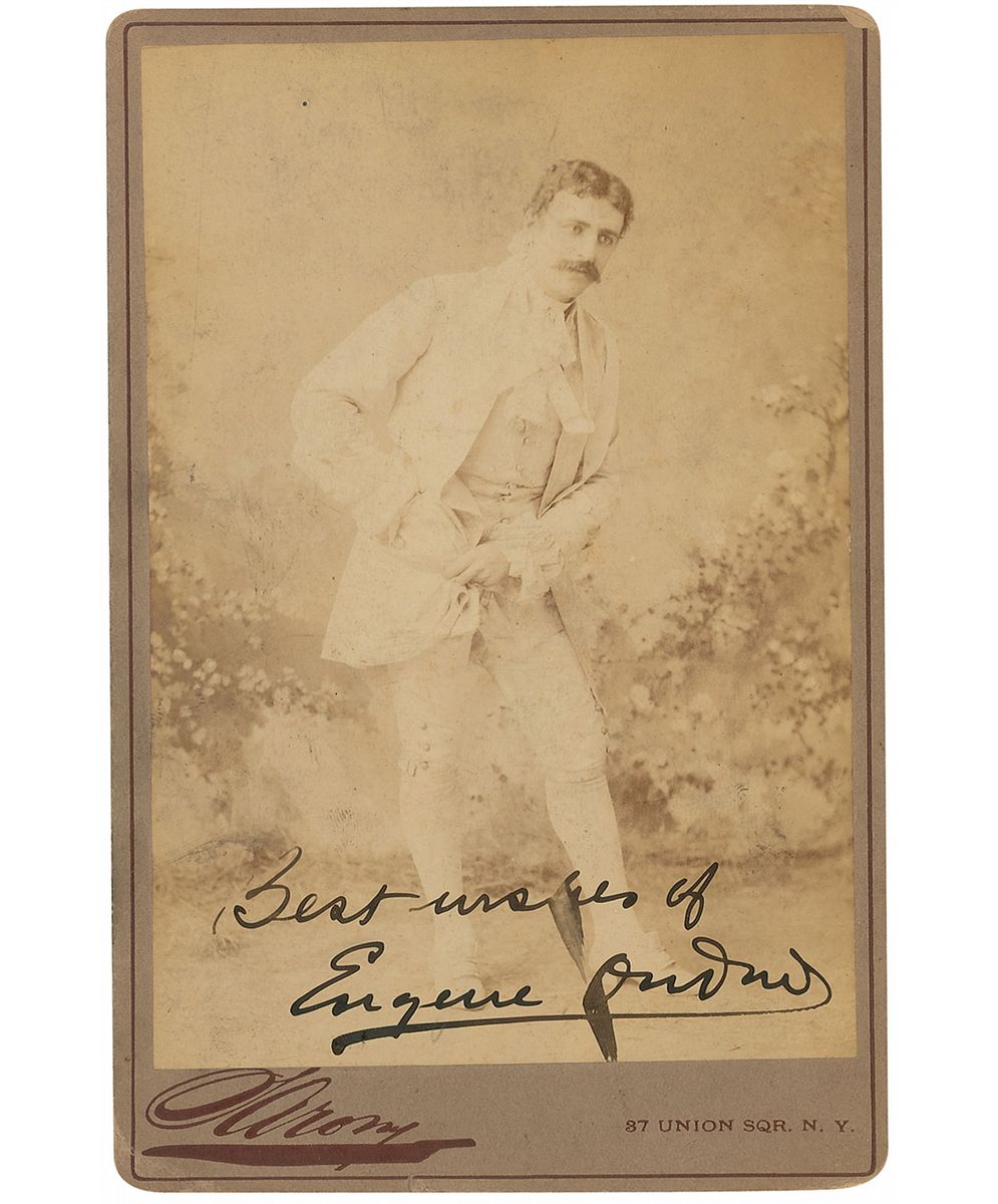 American baritone (1858–1894) who sang the part of the Templar Brian de Bois Guilbert in Sir Arthur Sullivan's grand opera, Ivanhoe. Original 4.25 x 6.5 full-length cabinet photo by Sarony, signed at the bottom of the image in fountain pen, “Best wishes of Eugene Oudin.” A few corner creases and edge dings, image a bit faded, and pencil notations to reverse, otherwise fine condition.