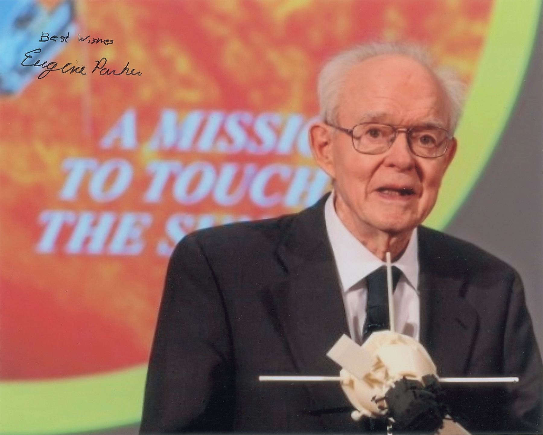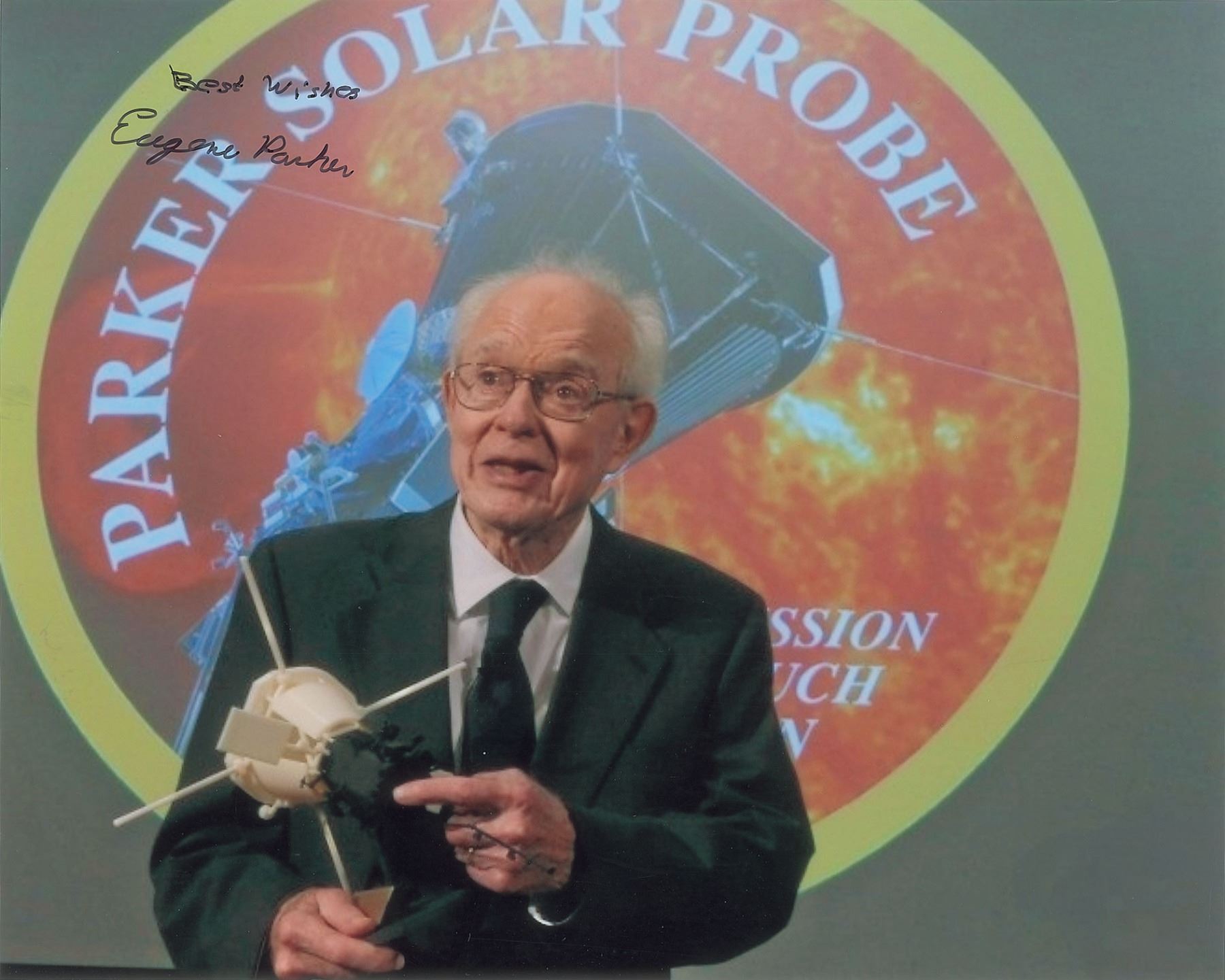 American solar astrophysicist (born 1927) who, in the mid-1950s, developed the theory of the supersonic solar wind and predicted the Parker spiral shape of the solar magnetic field in the outer solar system. Two color glossy 10 x 8 photos of Eugene Parker holding a model of the Parker Solar Probe during a presentation, both signed in black ink, "Best wishes, Eugene Parker." In overall fine condition. NASA renamed its Solar Probe Plus to Parker Solar Probe in Parker's honor, marking the first time NASA had named a spacecraft after a living person.