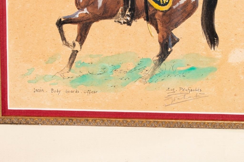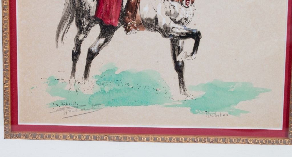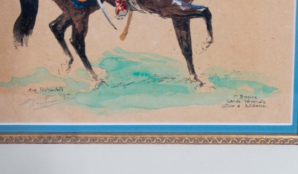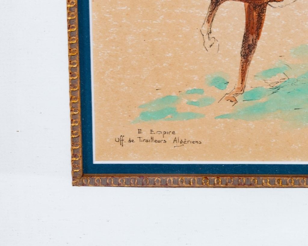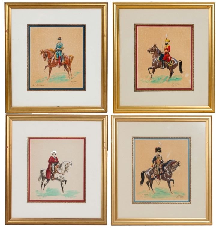 Item/Description: Four hand colored etchings, each pencil signed, in matching frames, feature mounted soldiers. Garde Imperiale / Officier d'artillerie; Richelieu (Cardinal Richelieu); India Body Guards Officer; II empire / off. deTirailleurs Algeriens.