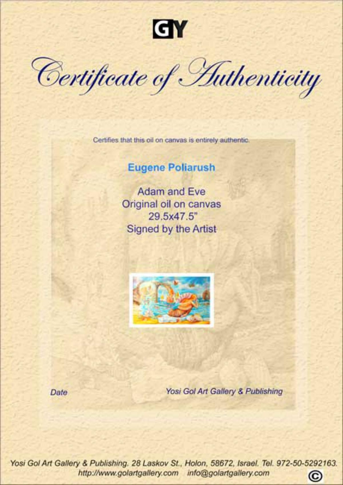 Artist: Eugene Poliarush. Medium: Original Oil on Canvas. Title: Adam and Eve. Size (Unframed): 29.5" x 47.5". Certificate of Authenticity: From the publisher. Reference# 10170.