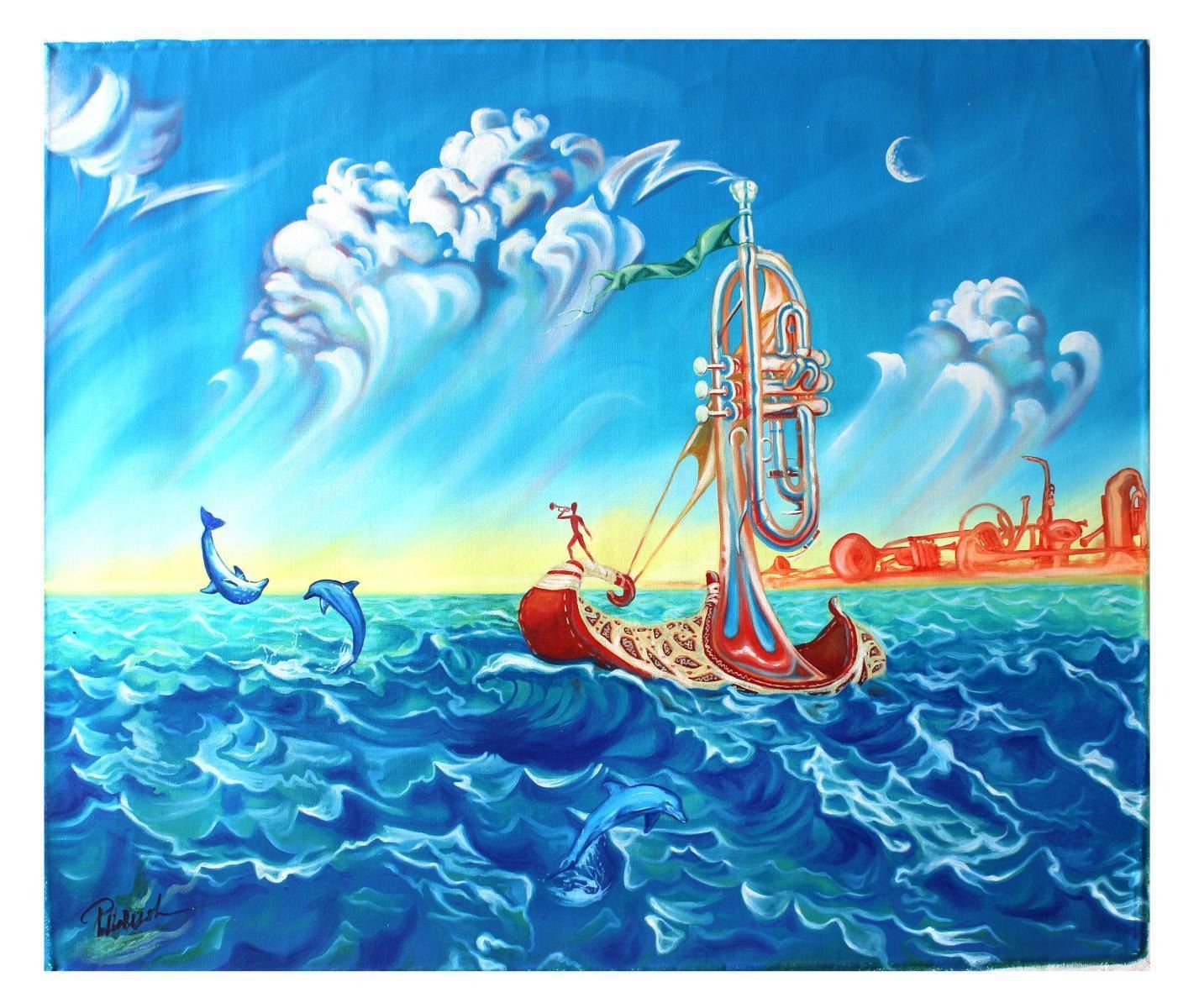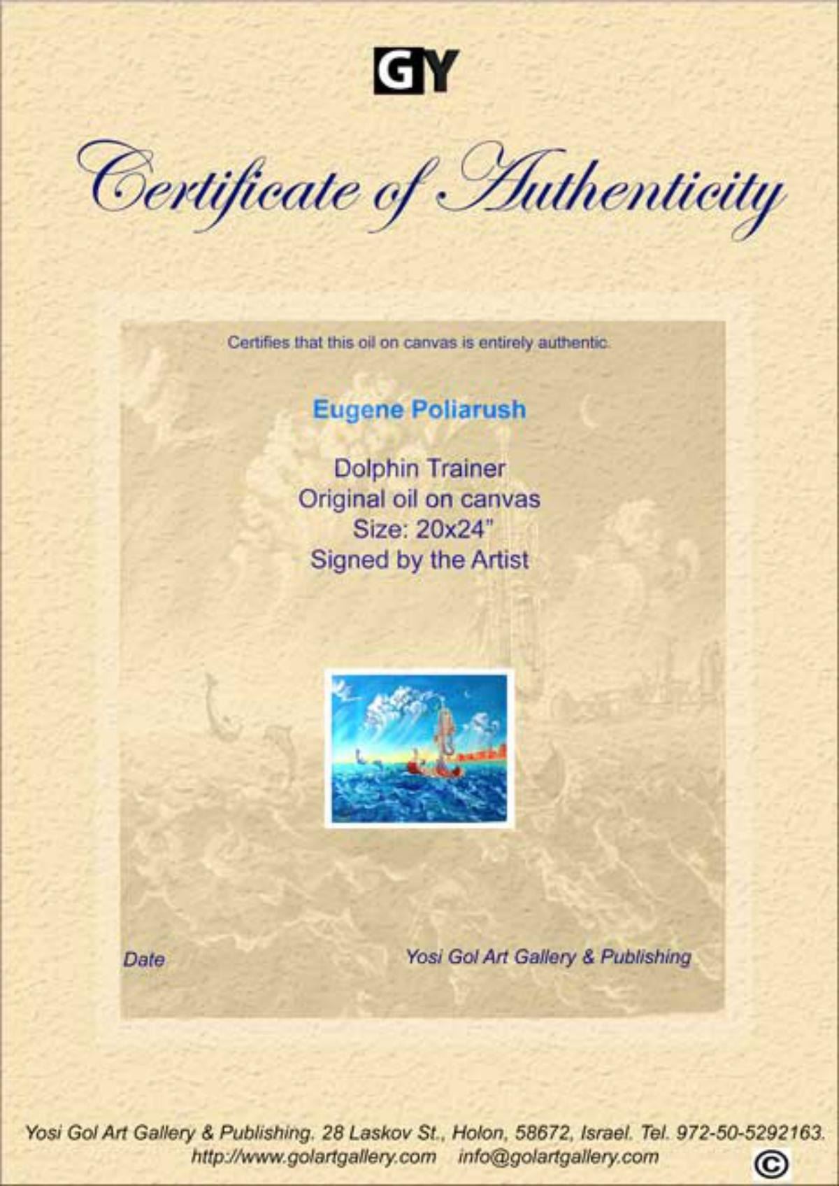 Artist: Eugene Poliarush. Medium: Original Oil on Canvas. Title: DOLPHIN TRAINER. Size (Unframed): 20" x 24". Certificate of Authenticity: From the publisher. Reference# 10161.