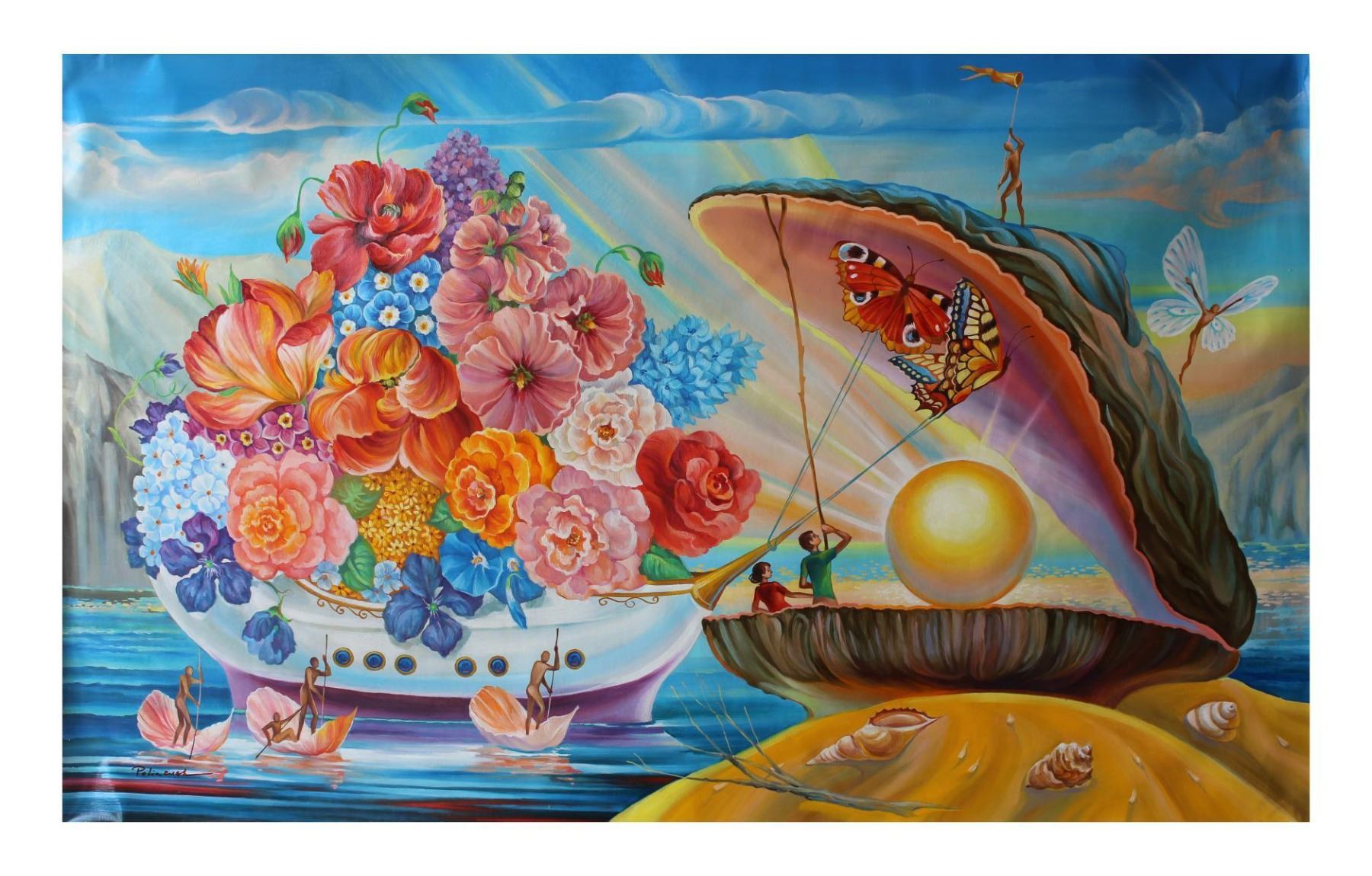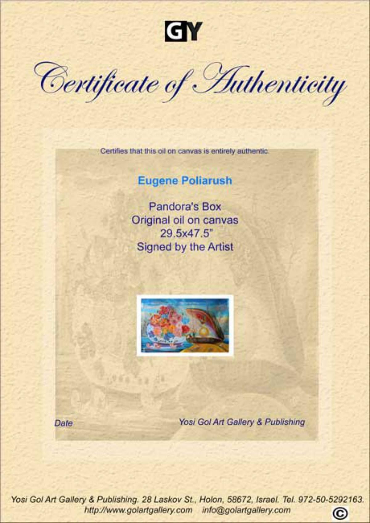 Artist: Eugene Poliarush. Medium: Original Oil on Canvas. Title: Pandora's Box. Size (Unframed): 29.5" x 47.5". Certificate of Authenticity: From the publisher. Reference# 10171.