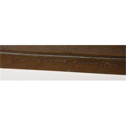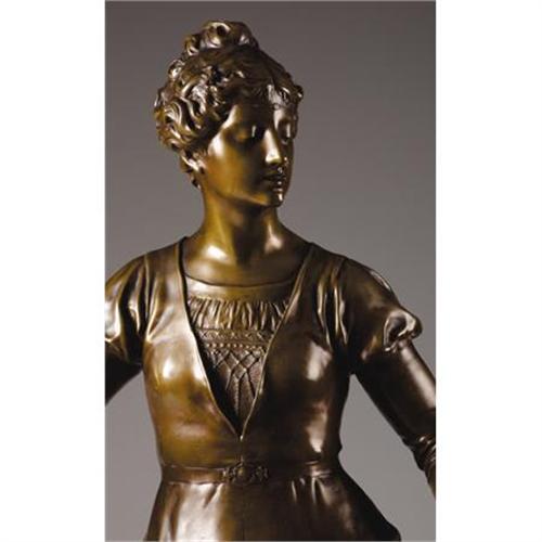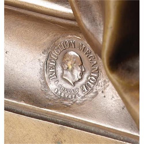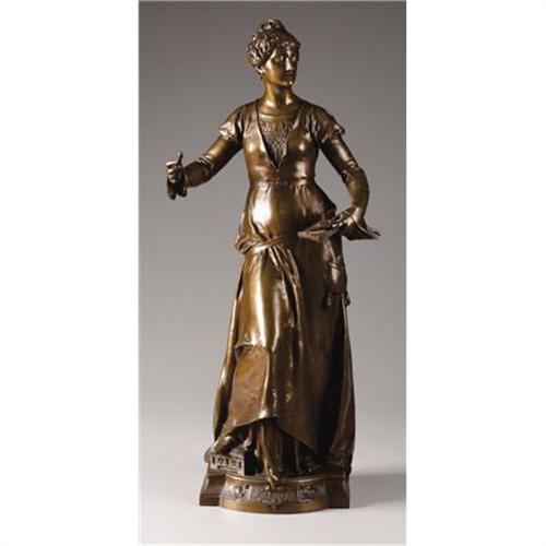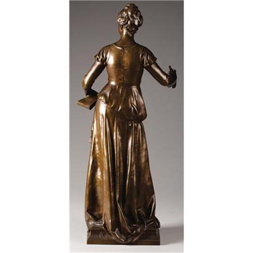 <B>EUGENE QUINTON (French, d. 1892)</B></I><BR><I>Melodie</B></I><BR>Bronze<BR>26 inches (66.0 cm)<BR>Signed on right side of base: <I>E. Quinton</B></I><BR>Foundry mark: <I>M. W. </B></I>and stamped:<I> Reduction Mecanique, A. Collas, Brevete</B></I><BR> <BR>This sculpture is of a standing, Victorian-era female figure, holding her place in a book with her left hand. Her long, ankle-length skirt is wonderfully detailed, as is the tufted stool on which her right foot rests. Her long hair is caught in a loose bun; her eyes are cast downward.<BR><BR>The <I>Reduction Mecanique A. Collas, Brevete</B></I> seal denotes that this sculpture is a smaller version of another <I>Melodie.</B></I><BR><BR><b>Shipping:</b> Requires 3rd Party Shipping (<a target="_blank" href="http://www.heritageauctions.com/common/shipping.php">view shipping information</a>)