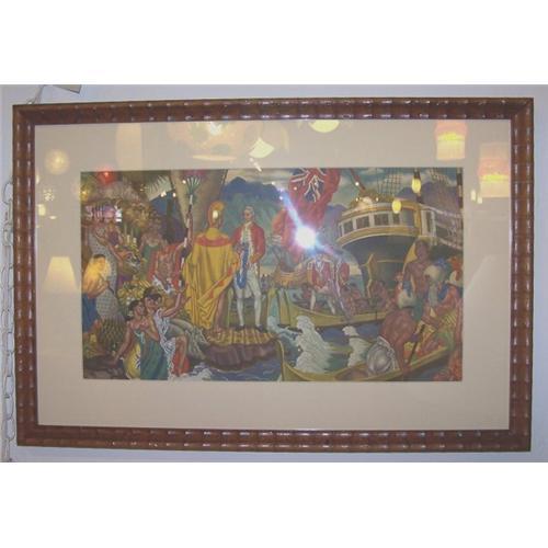 Menue cover by Eugene Savage. Scene description on reverse side. Commissioned by the Matson Navigation Company for cruise voyages to Hawaii.