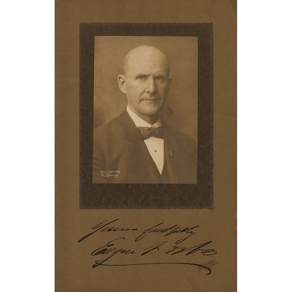 Influential American socialist and labor activist (1855–1926) who founded the American Railway Union, the Social Democratic Party of America, and the Industrial Workers of the World Vintage matte-finish 3.75 x 5.5 photo of Debs by Bundy, affixed to its original 7 x 11 mount, prominently signed on the mount in ink, "Yours faithfully, Eugene V. Debs." In fine condition.