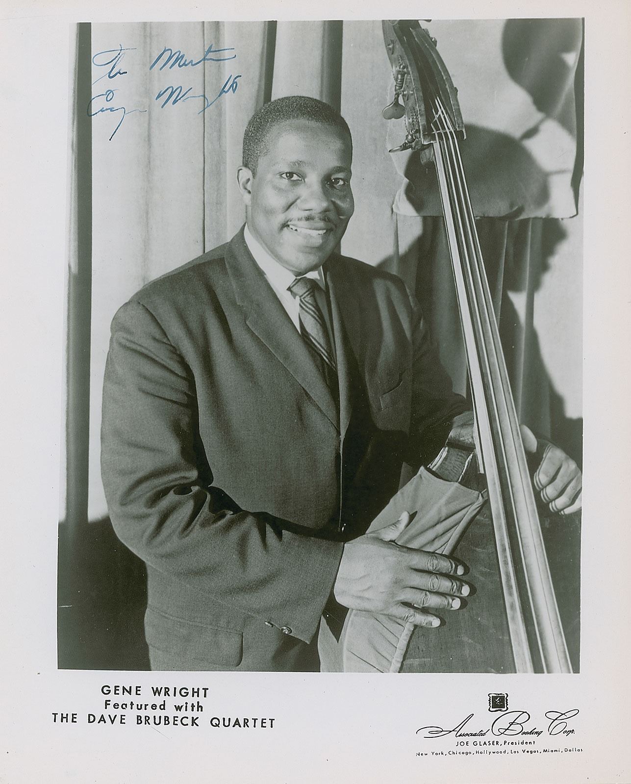 Vintage glossy 8 x 10 publicity photo of Wright as the bassist for the Dave Brubeck Quartet, signed and inscribed in fountain pen "To Martin, Eugene Wright.” In fine condition.