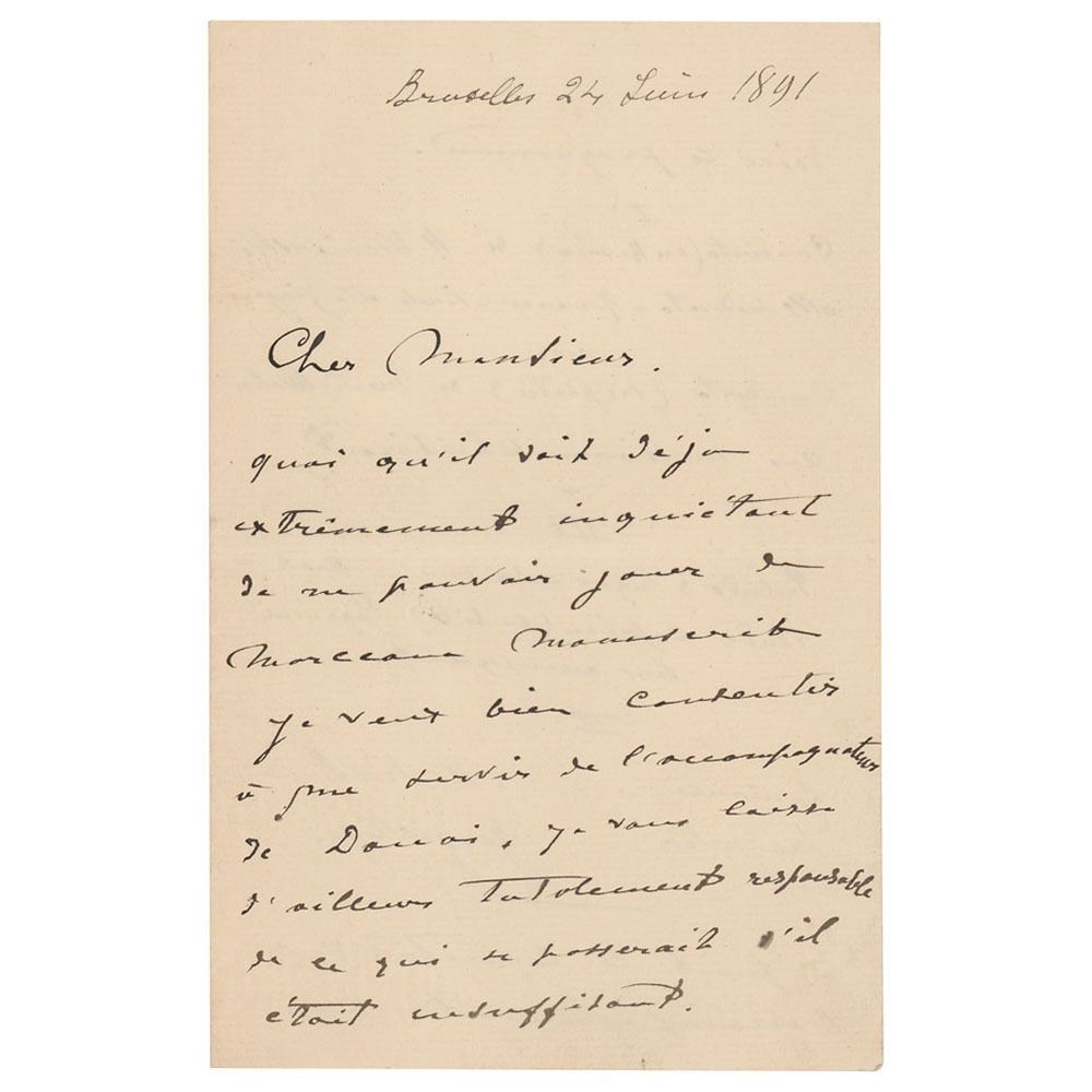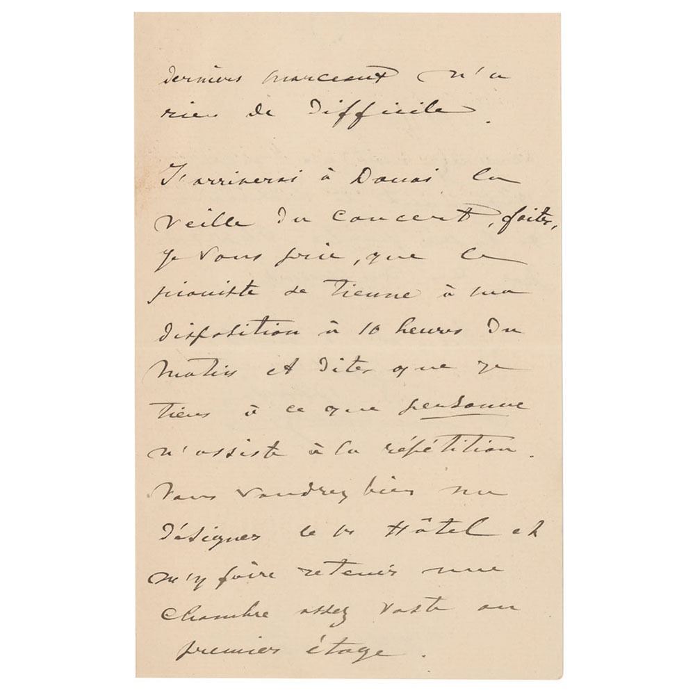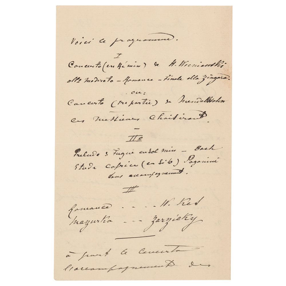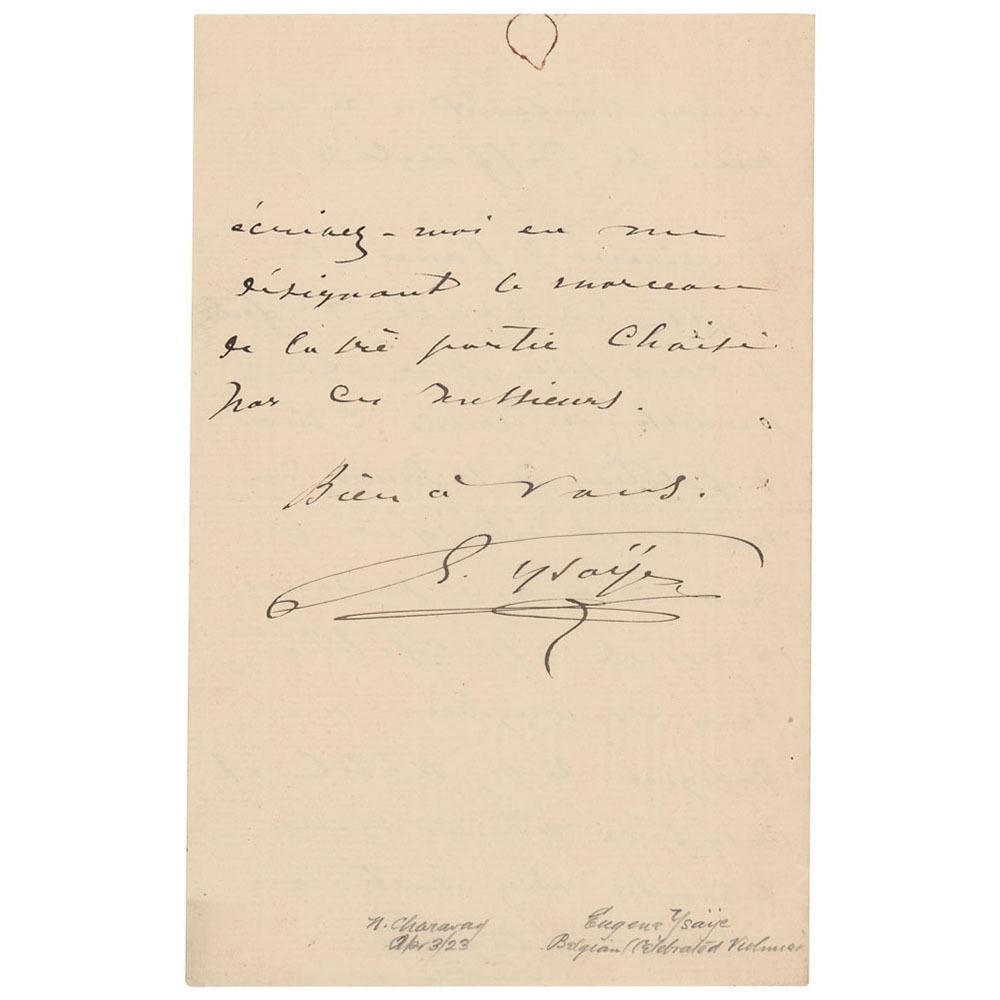 ALS in French, signed “E. Ysaye,†four pages on two adjoining sheets, 4.5 x 7, June 24, 1891. Untranslated handwritten letter outlining a concert program, to include a concerto by Henryk Wieniawski, a concerto by Felix Mendelssohn, a prelude and fugue by Johann Sebastian Bach, and an etude by Niccolo Paganini. In fine condition.