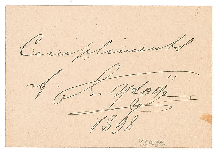 Vintage ink signature, "Compliments of E. Ysaye, 1898,” on an off-white 3.25 x 2.25 card. In fine condition, with a small stain to the right edge.