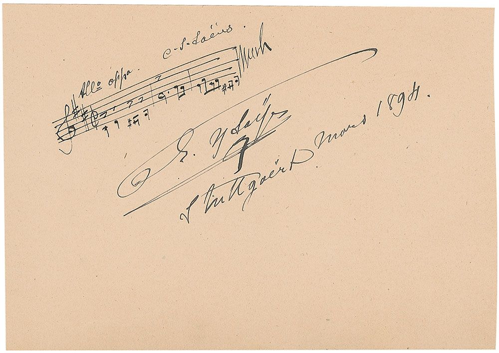 Belgian violin virtuoso, composer, and conductor (1858–1931) known as ‘The King of the Violin.’ AMQS on an off-white 6.5 x 4 sheet. Ysaye pens three bars of an unidentified work, making two notations above the quote, and signing underneath, “E. Ysaye, Stuttgart, Mars 1894.” In fine condition.