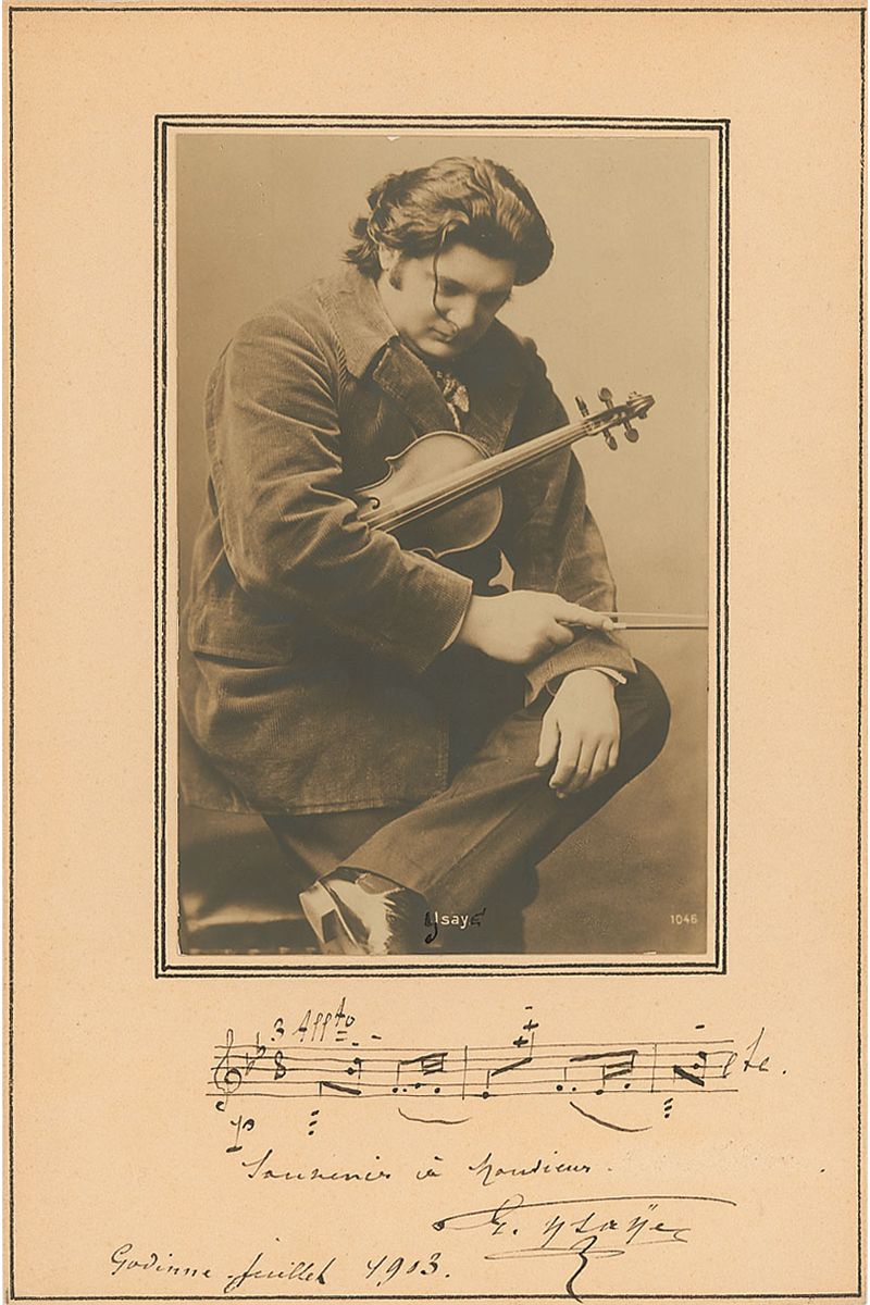 Belgian violin virtuoso, composer, and conductor (1858–1931) known as ‘The King of the Violin.’ Vintage 3.25 x 5 postcard photo, affixed to a 5.75 x 8.25 mount, signed on the mount in black ink, “E. Ysaye,” and dated July 1903, with Ysaye adding a very nice three-bar AMQS from an unidentified work above his signature. In fine condition.