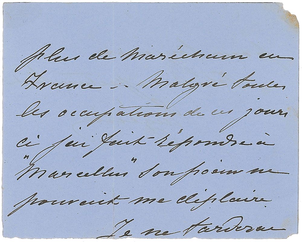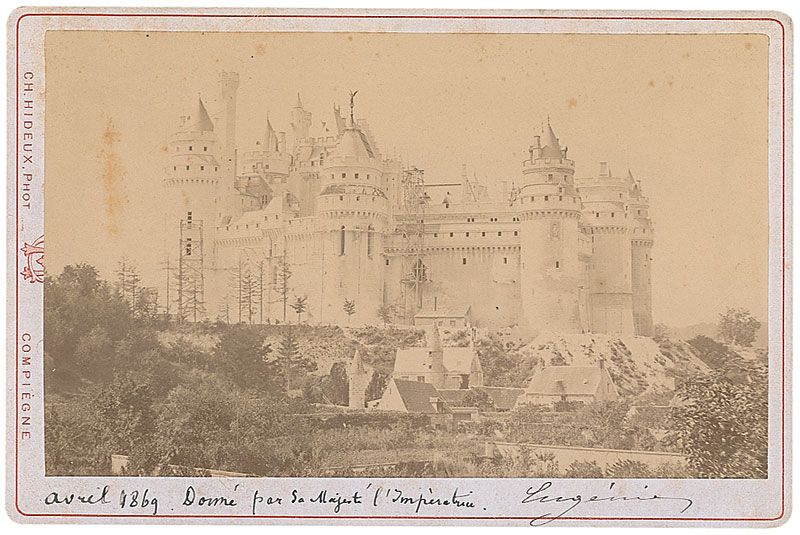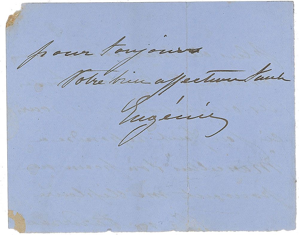 Last Empress consort of the French from 1853 to 1871 as the wife of Napoleon III, Emperor of the French. Vintage 6.5 x 4 photo of Pierrefonds Castle, signed in the lower border in black ink. A notation in an unknown hand in the border reads, “April 1869. Given by Her Majesty the Empress.” Some scattered light spotting to image and a bit of trivial foxing to edges, otherwise fine condition. Accompanied by a small portion of an ALS, signed “Eugenie,” to her nephew, reading in part: “No more marshals in France...I informed ‘Marcellus’ [(poem by Count Matheus on the death of the Prince Imperial)] that his poem could not displease me." In exile Eugenie traveled under the name 'Countess de Pierrefonds.
