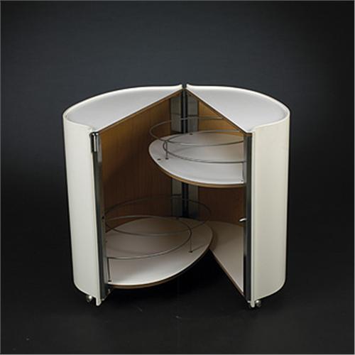 Eugenio Gerli bar, model #B106 Tecno Italy, 1966 lacquered plywood, aluminum, laminate, stainless steel 35"w x 21.5"d x 28"h Two-part exterior opens to reveal two shelves with steel details. Manufacturer's label to interior. Literature: Repertorio 1950-1980, Gramigna, pg. 239